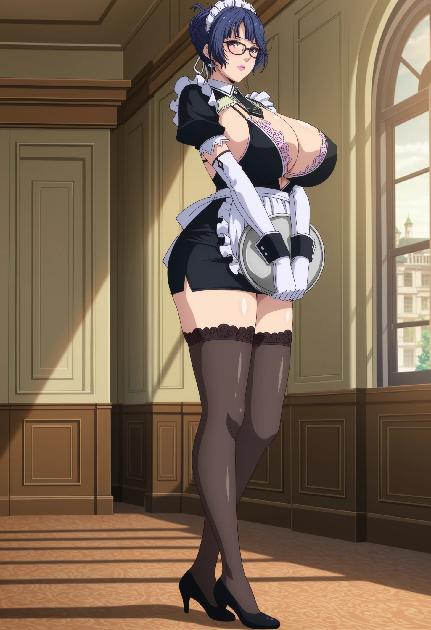 maid headdress, short dress, frilled apron, maid apron, bra peek, shrug \(clothing\), white gloves, elbow gloves, wrist cuffs, black thighhighs, lace-trimmed thighhighs, short necktie, plunging neckline, black footwear, shoes