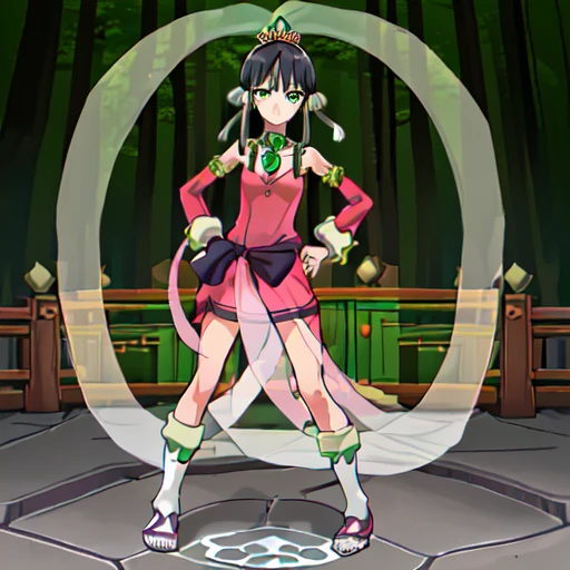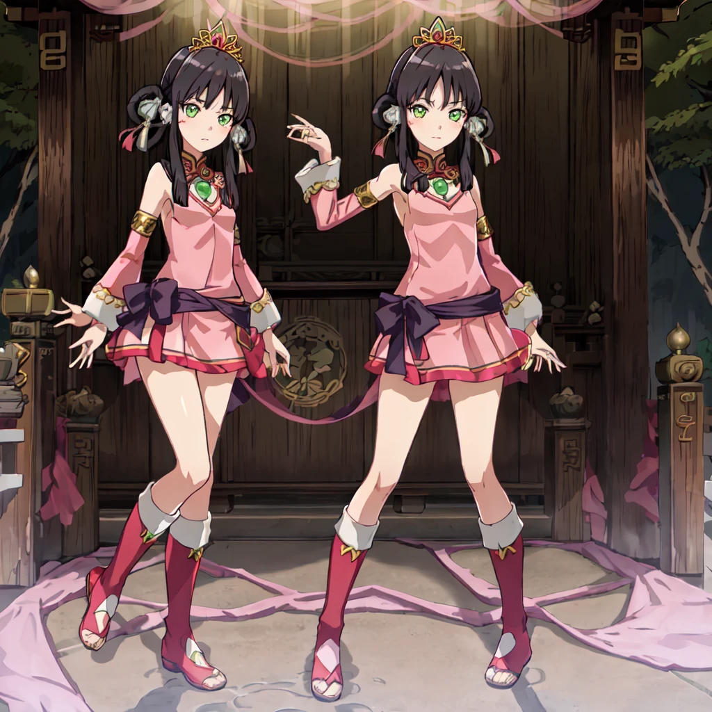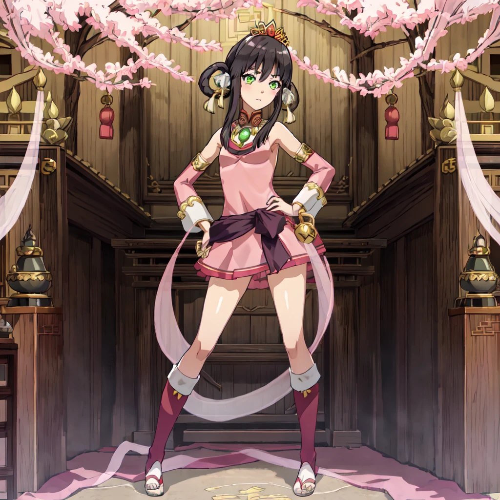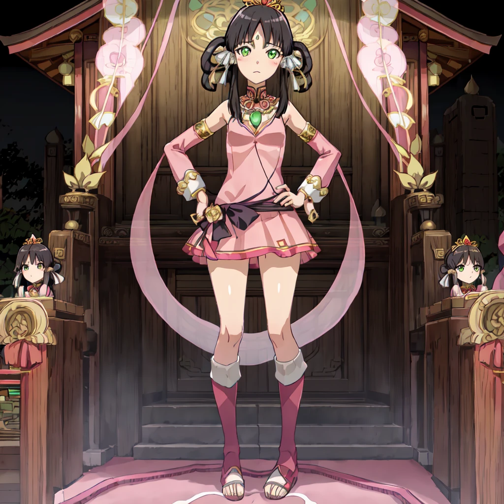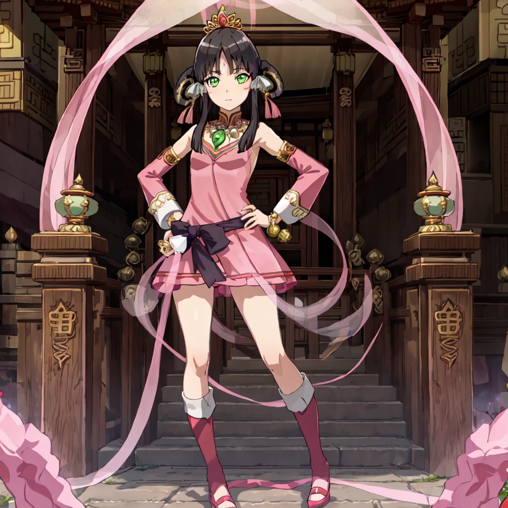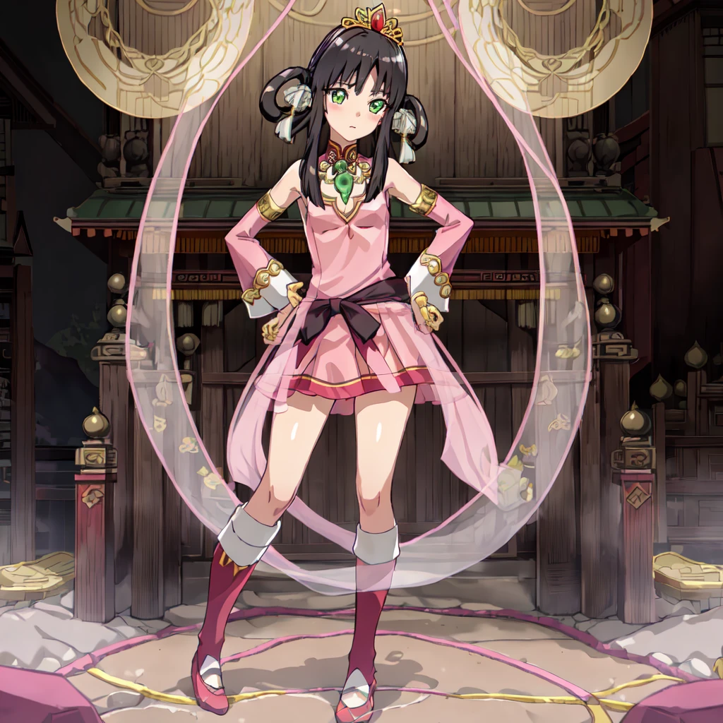 Pose 1 : Raypa_Padma_Kurin,1girl, solo, black hair, pink dress, pink skirt, ribbon, bare shoulders, jewelry, green eyes, sidelocks, red detached sleeves, necklace, flat chest, facial mark, chinese clothes, tiara, hair rings, red footwear, standing, full body, hand on hips