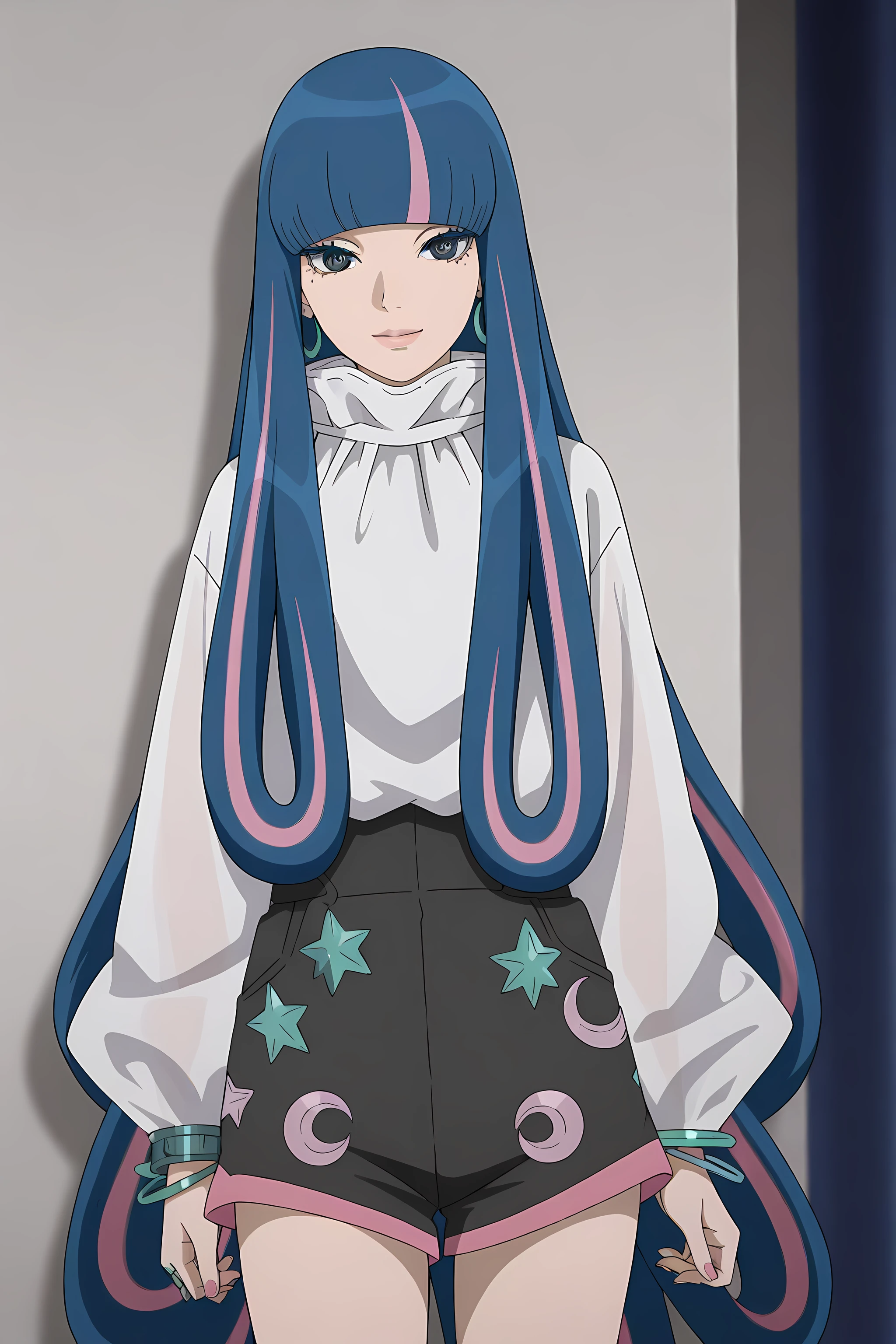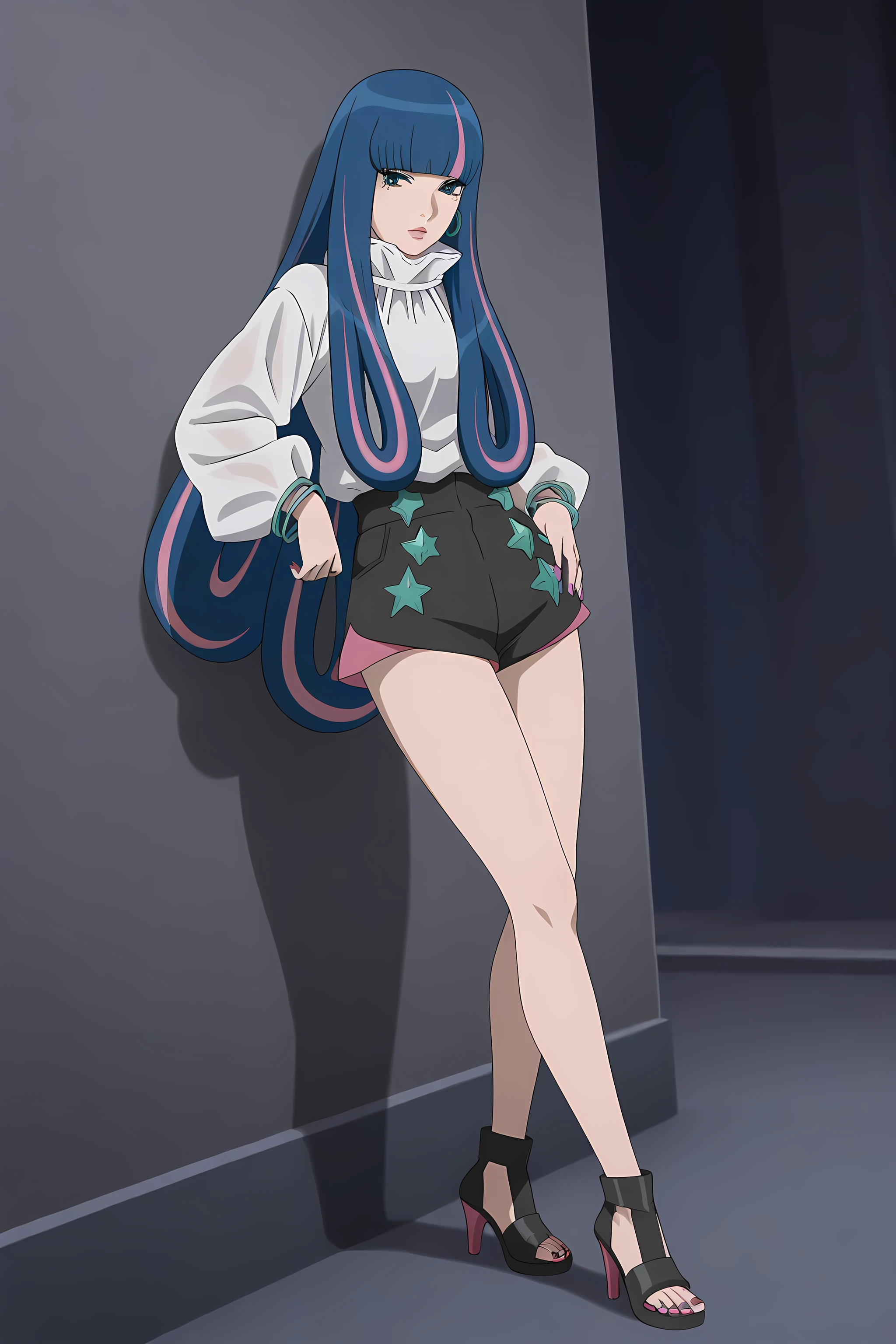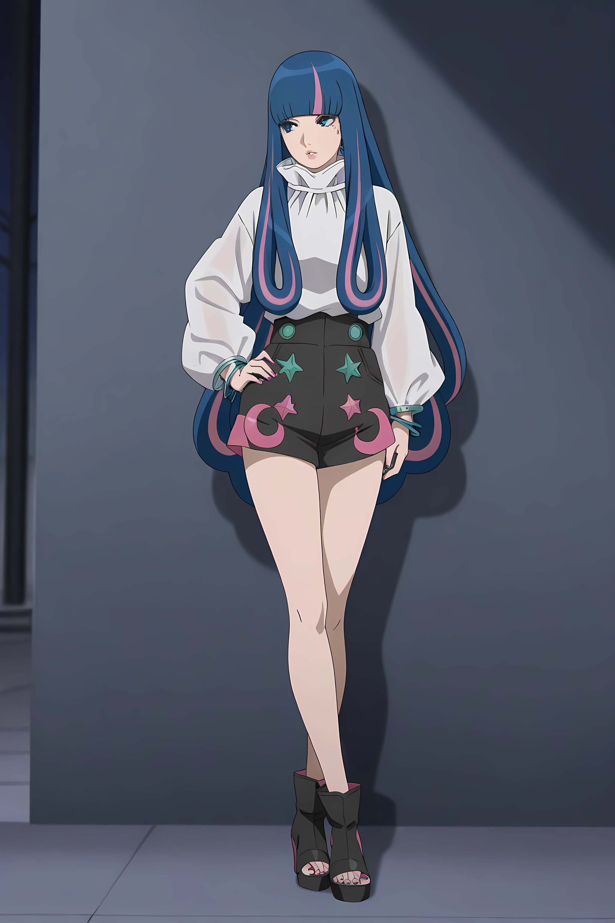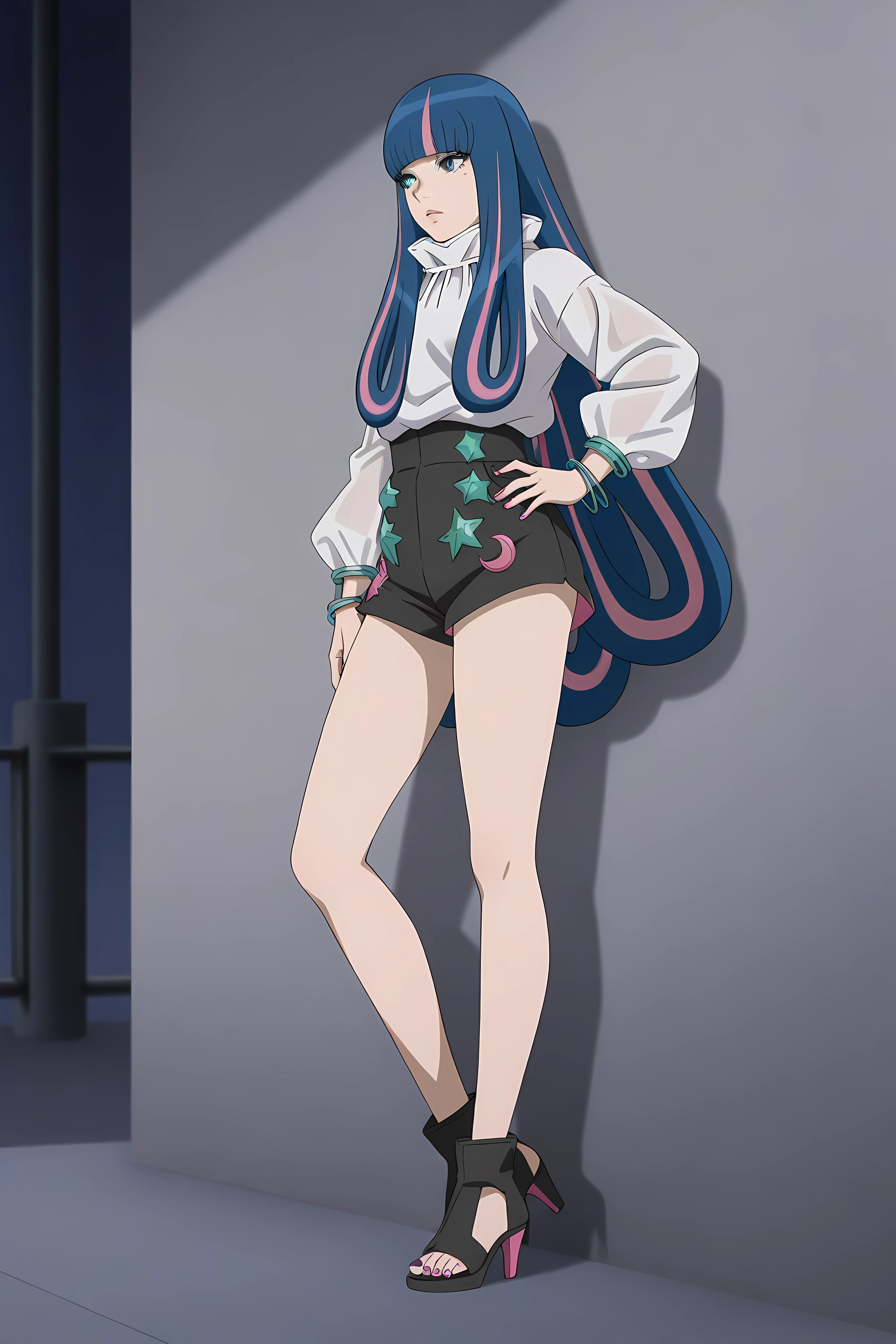 eida_boruto, 1girl, long hair, multicolored hair, shorts, green eyes, blue hair, high heels, jewelry, nail polish, bangs, pink hair, bracelet, blunt bangs,