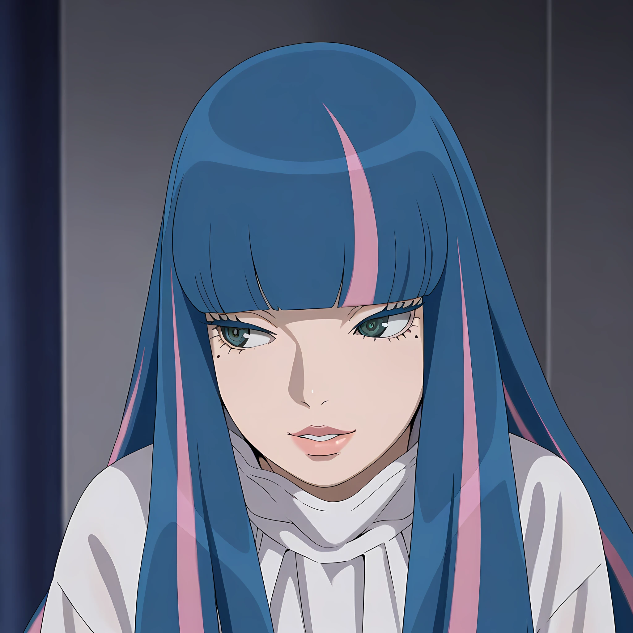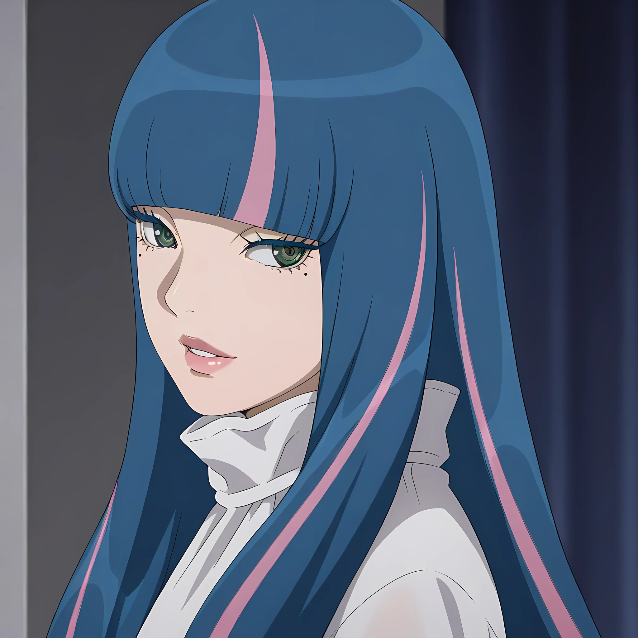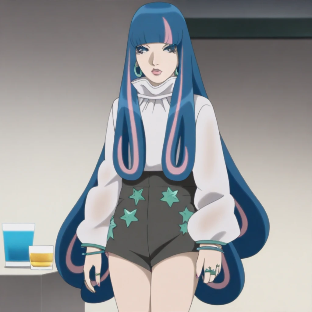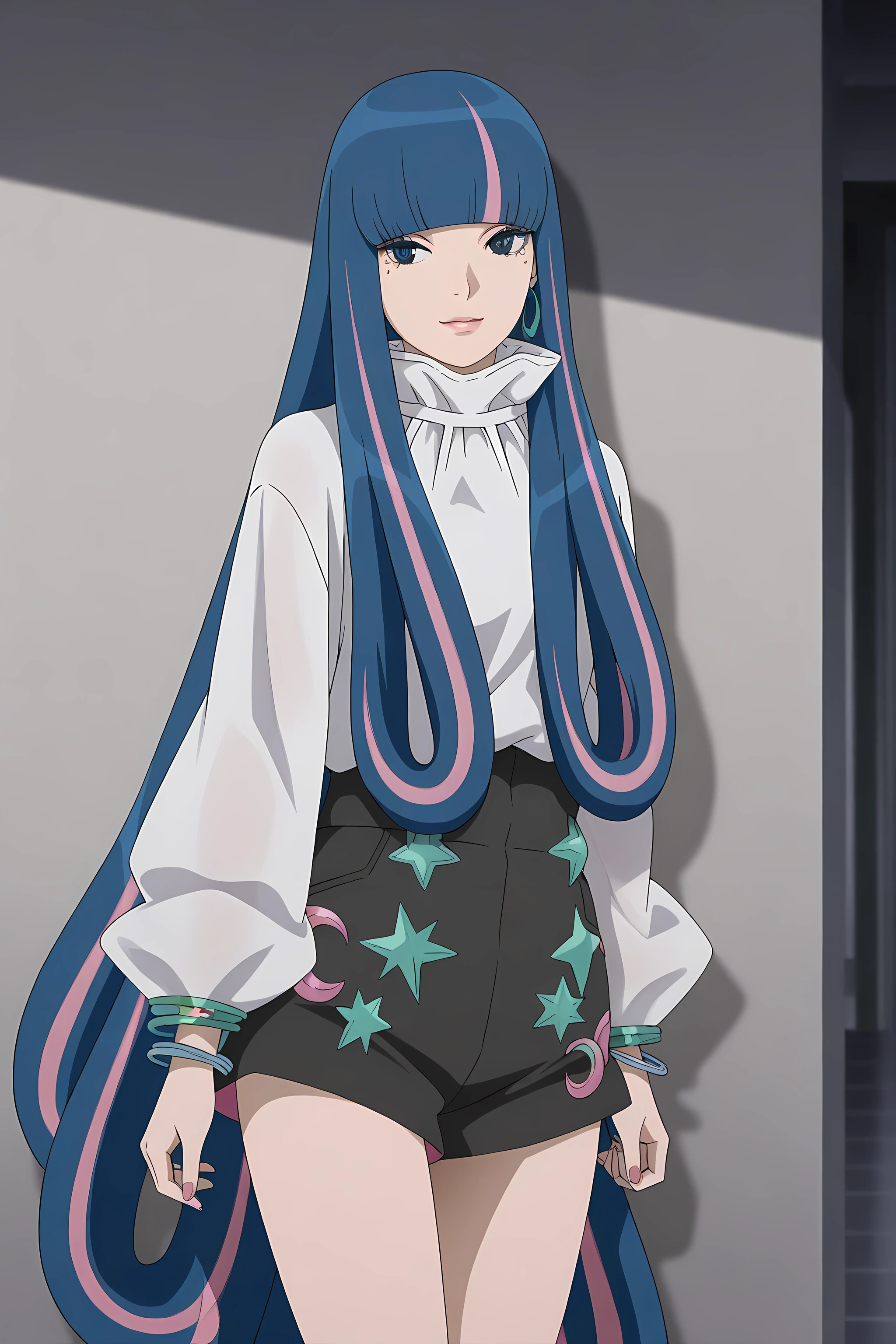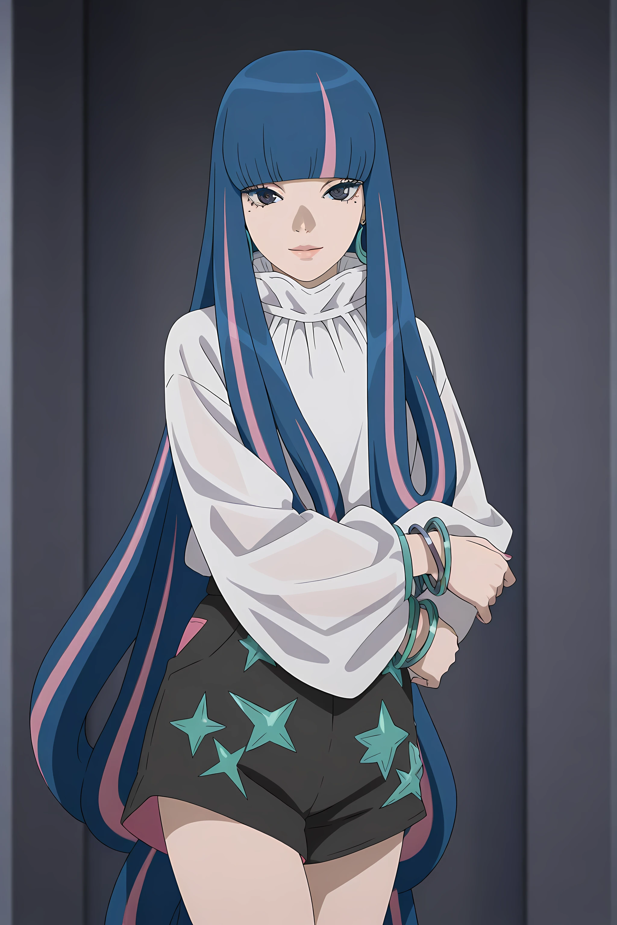eida_boruto, 1girl, long hair, multicolored hair, shorts, green eyes, blue hair, high heels, jewelry, nail polish, bangs, pink hair, bracelet, blunt bangs,