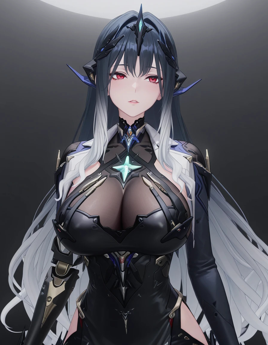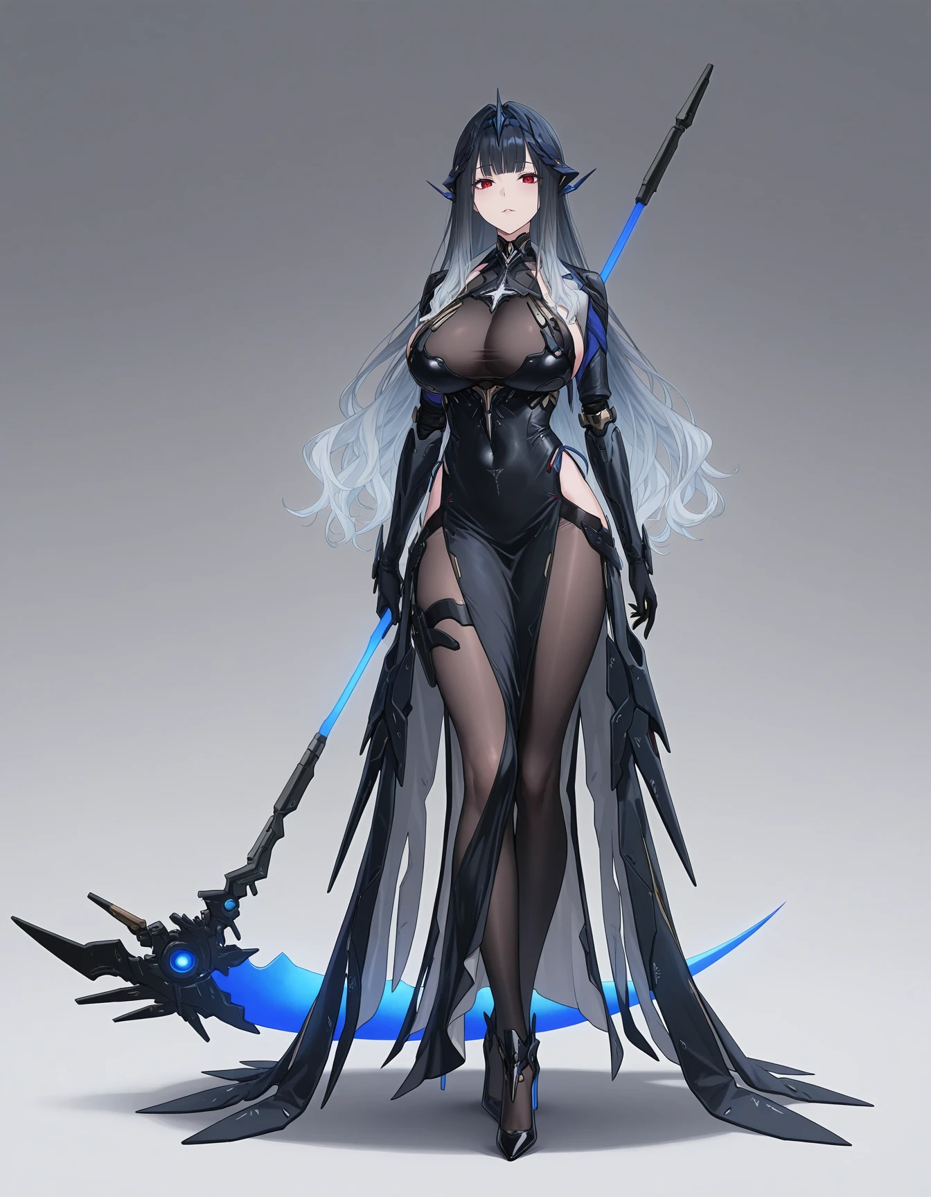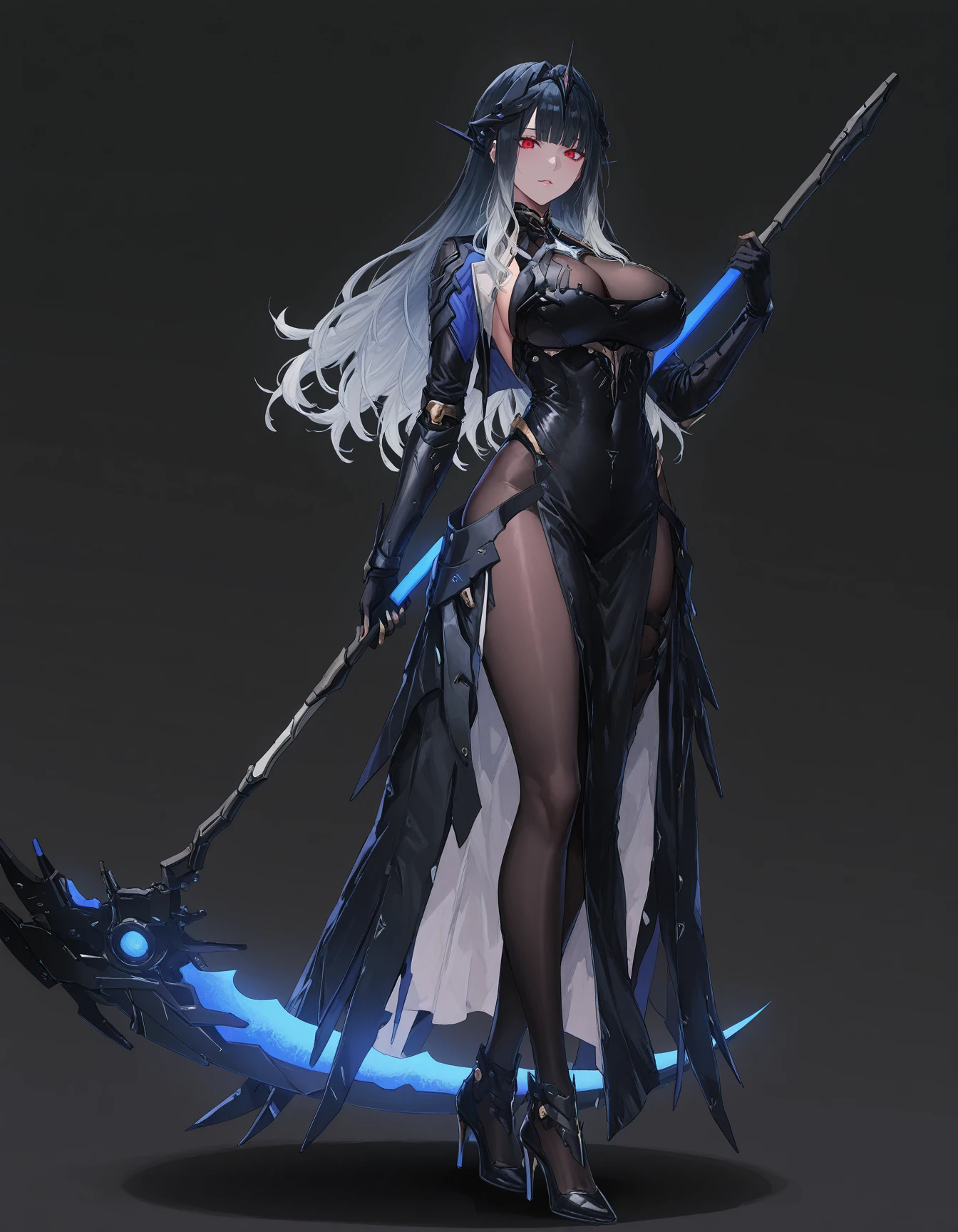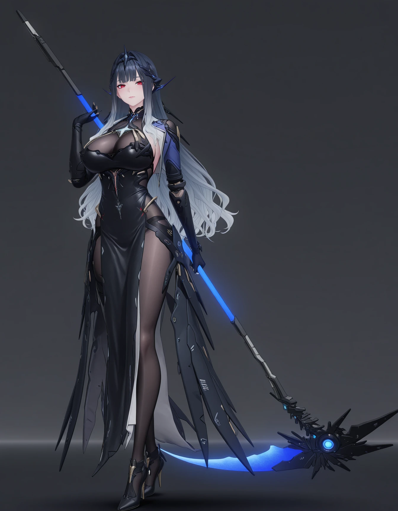 mai_pgr_netiya_wg,3d,long_hair,mature_female,aged_up,blunt_bangs,gradient_hair,red_eyes,large_breasts,headgear,black_dress,mecha_musume,single_mechanical_arm,mechanical_legs,high_heels,black_pantyhose,holding_scytheBig sister