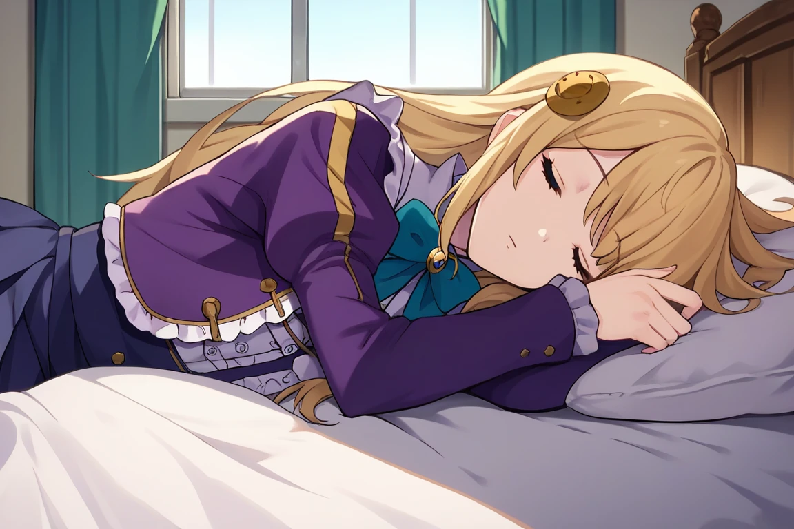 hair ornament, frills, shirt, white shirt, blue ribbon, brooch, striped clothes, center frills, buttons, jacket, cropped jacket, purple jacket, puffy sleeves, long sleeves, skirt, high-waist skirt, pleated skirt, purple skirt, purple thighhighs, zettai ryouiki, shoes, white footwear, mary janes, Tips to save you some time: