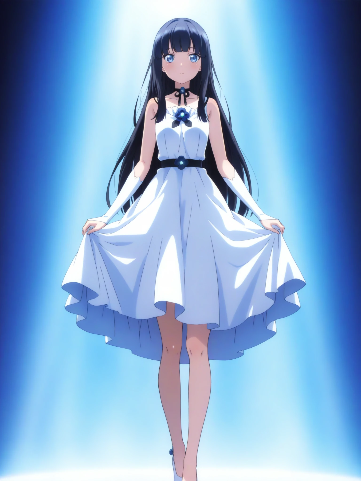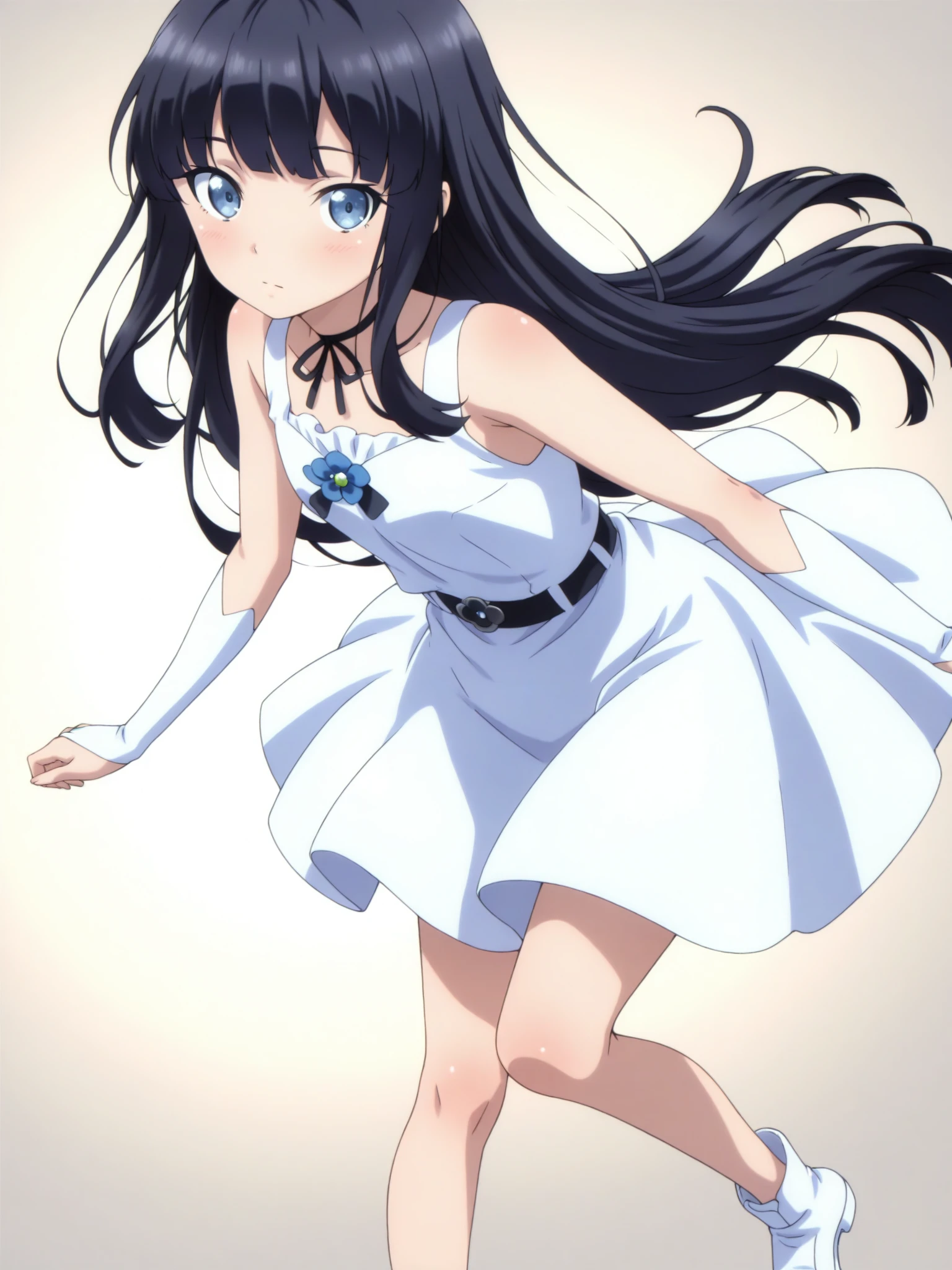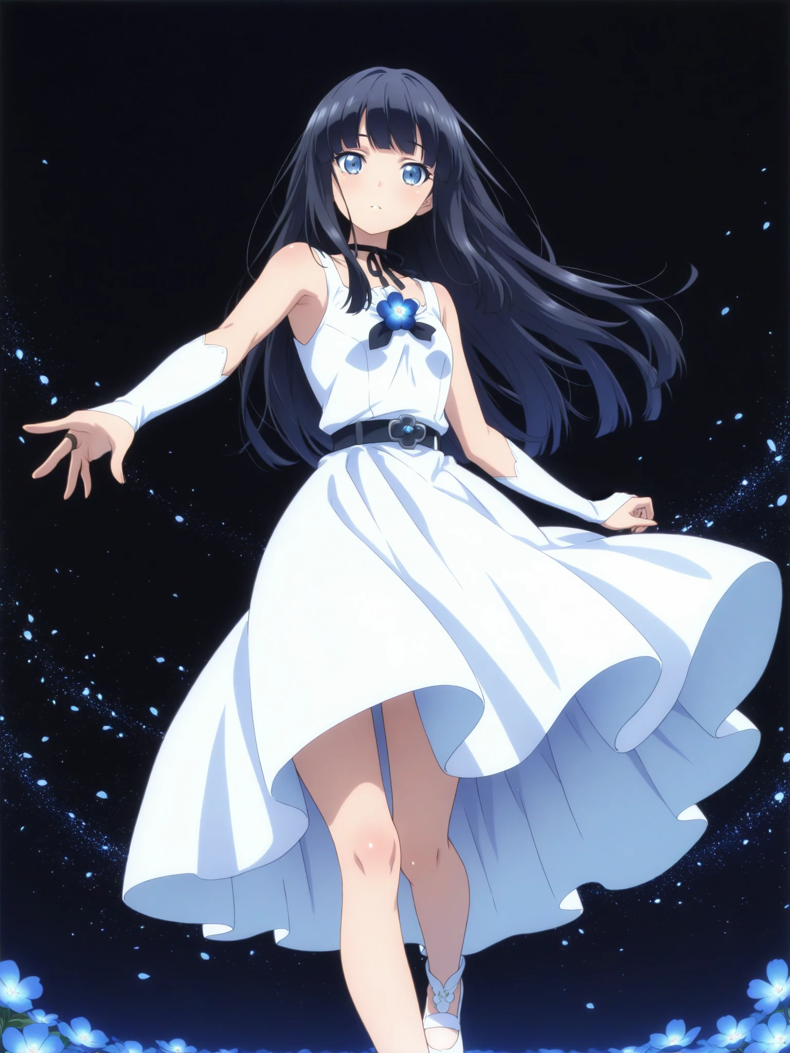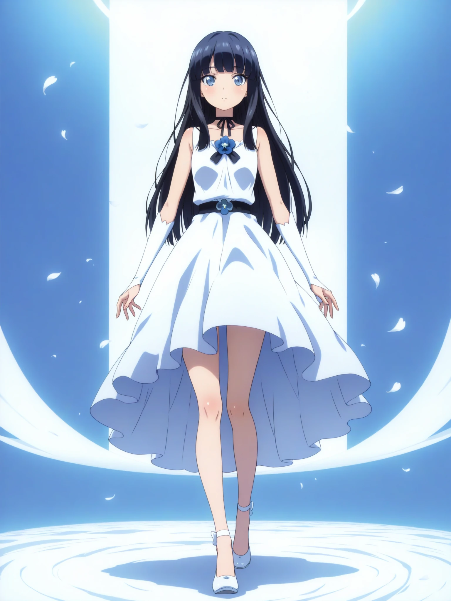Clothes: (white dress, sleeveless knee-length dress, flower brooch, ribbon choker, (white bridal gauntlets), black belt, white shoes)
