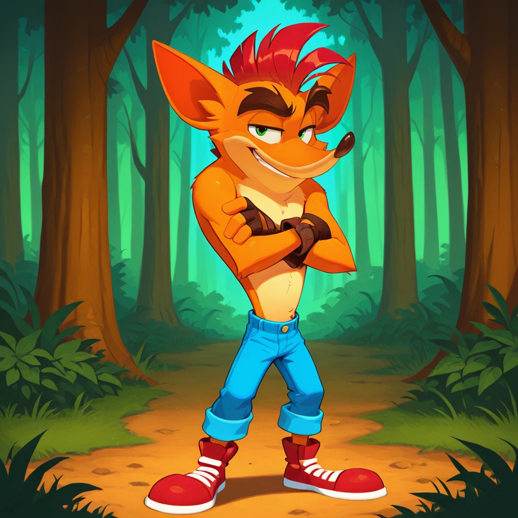 Crash Bandicoot,Furry,Orange Fur,Light Orange Under Belly,Green Eyes,Mohawk,Red Hair,Thick Eyebrows,Dark Brown Nose,Big Pointy Ears,Fingerless Gloves,Blue Jeans,Red Shoes with White soles and laces