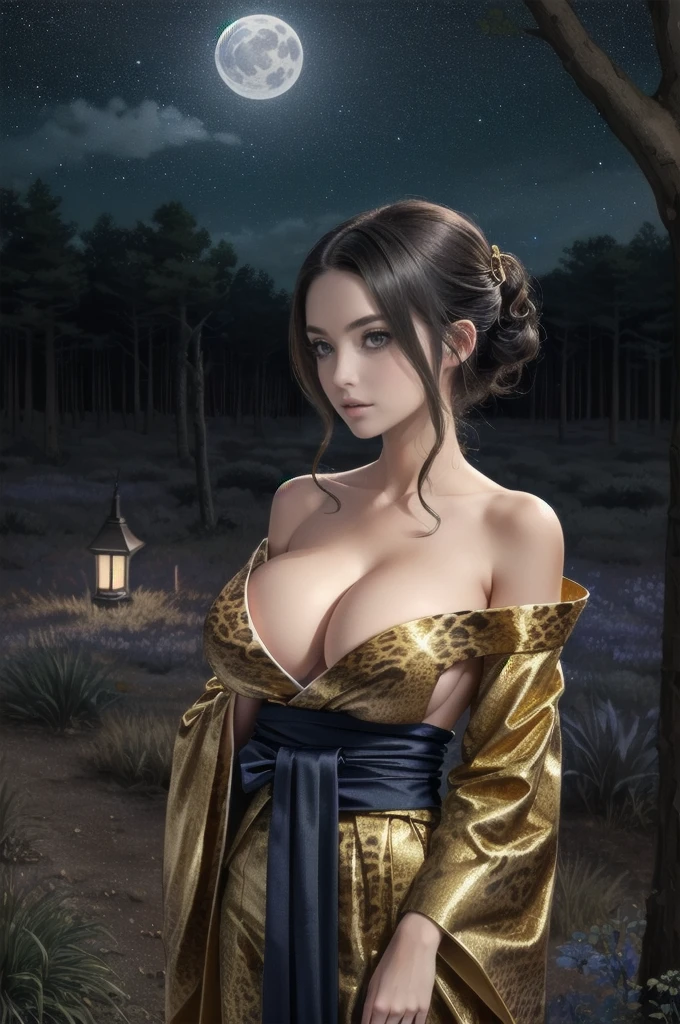 ((medium shot:1.5)))photo of a 30 years old (j3d-2250_) ( (A tranquil, sunlit forest glade with dappled sunlight and a peaceful atmosphere) warm smile, sfw(facing side leaning forward head turned Looking at viewer over shoulder,small waist, medium hips, (big natural breast:1.5) sideboob) (Tapered bob) hair, glossy lips, soft skin, elegant makeup, wearing (Fluorescent Blue) (lace) (animal print), (layered dress))