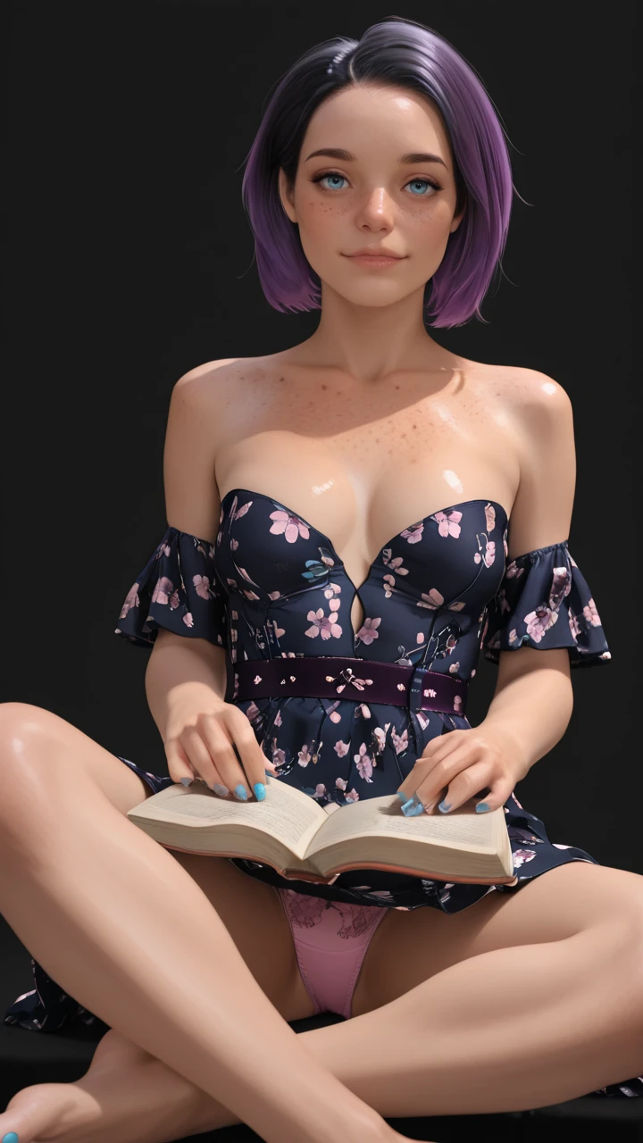 dark blue dress, floral print dress, pink floral print, strapless, detatched sleeves, midriff cutout, cleavage, purple belt, weave pattern belt, short dress
