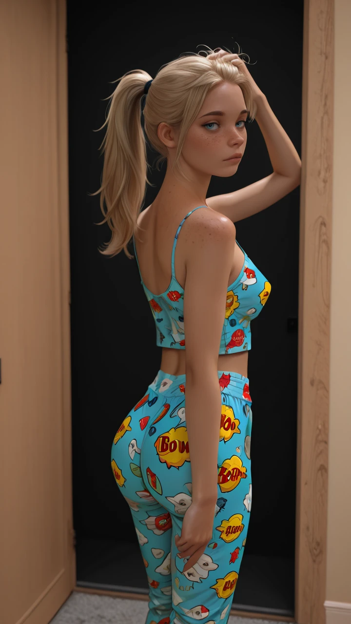blue comic print pajama cami, comic font print, speech bubble print, pow font in comic print, bare shoulders, midriff, blue comic print pajama bottoms, blue tied waist-string