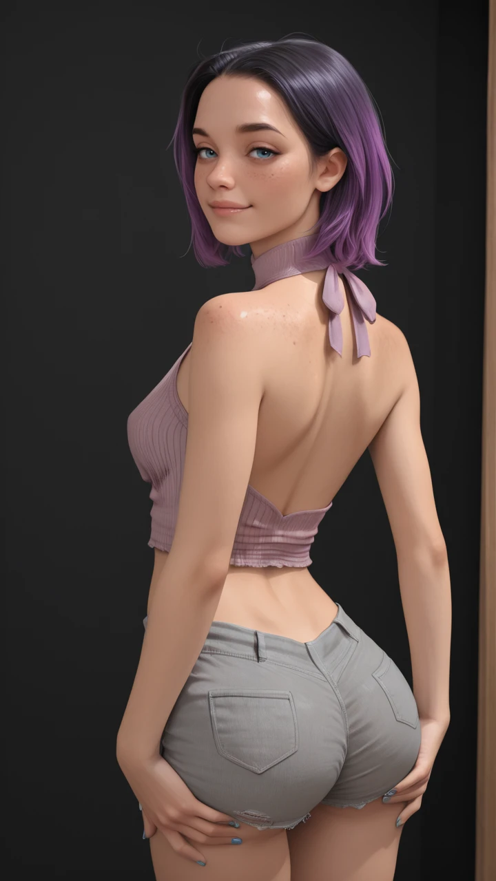 mauve top, halter neck top, ribbed top, sleeveless, backless top, midriff, gray short shorts, frayed short shorts, buttoned short shorts