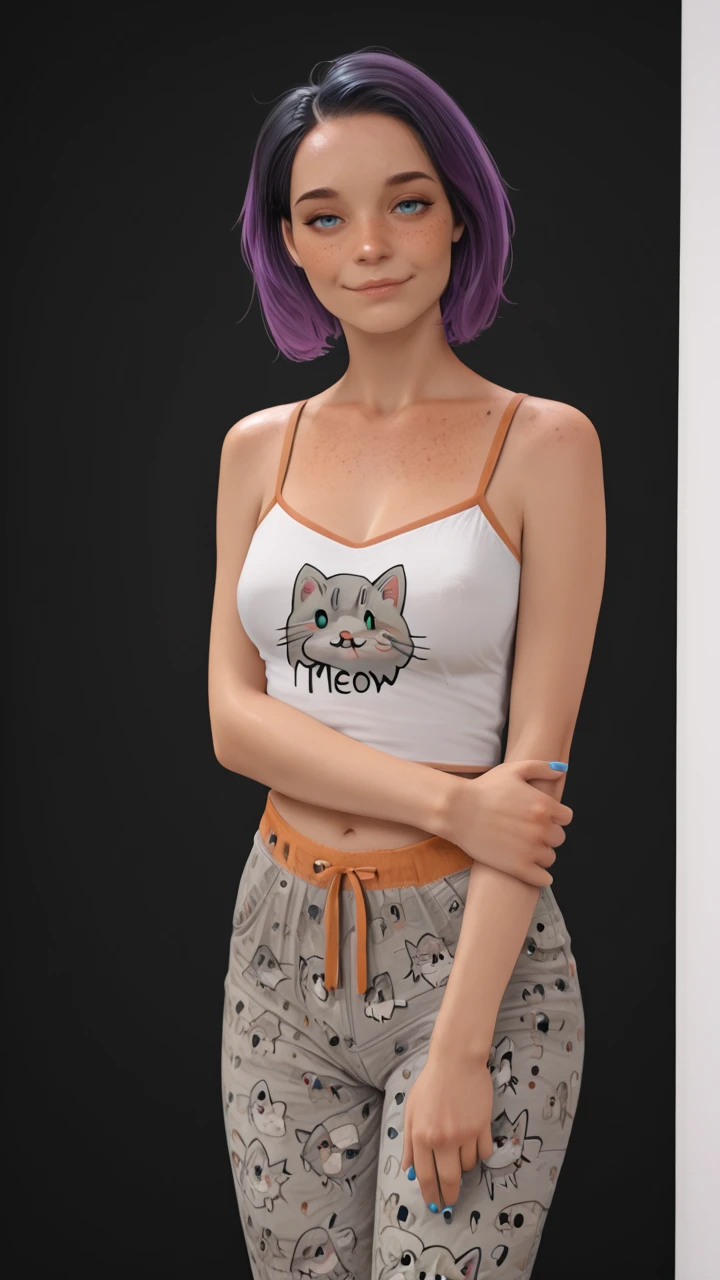 white camisole, kitten face print camisole, meow font on camisole, gray kitten face on camisole, orange trim, orange shoulder straps, midriff, gray pajama pants, orange tied waist-string, gray kitten faces on pajama pants