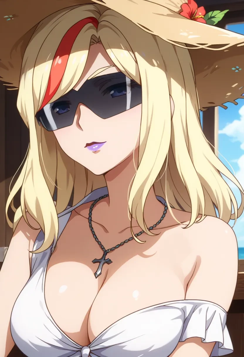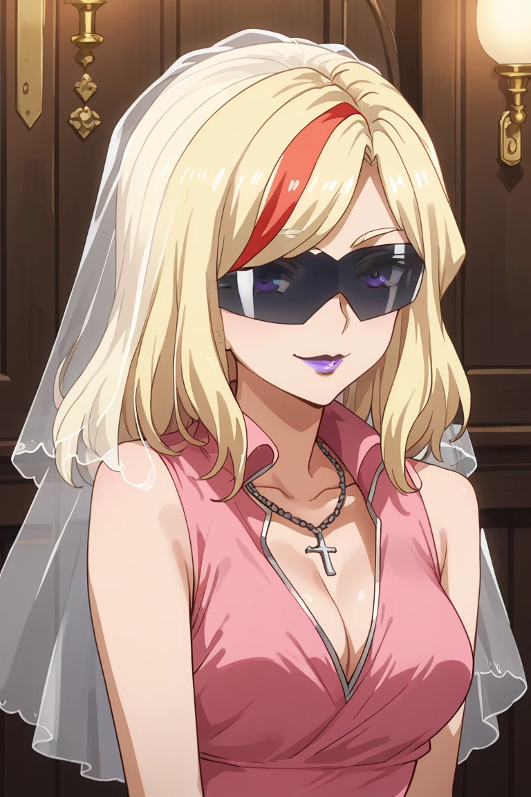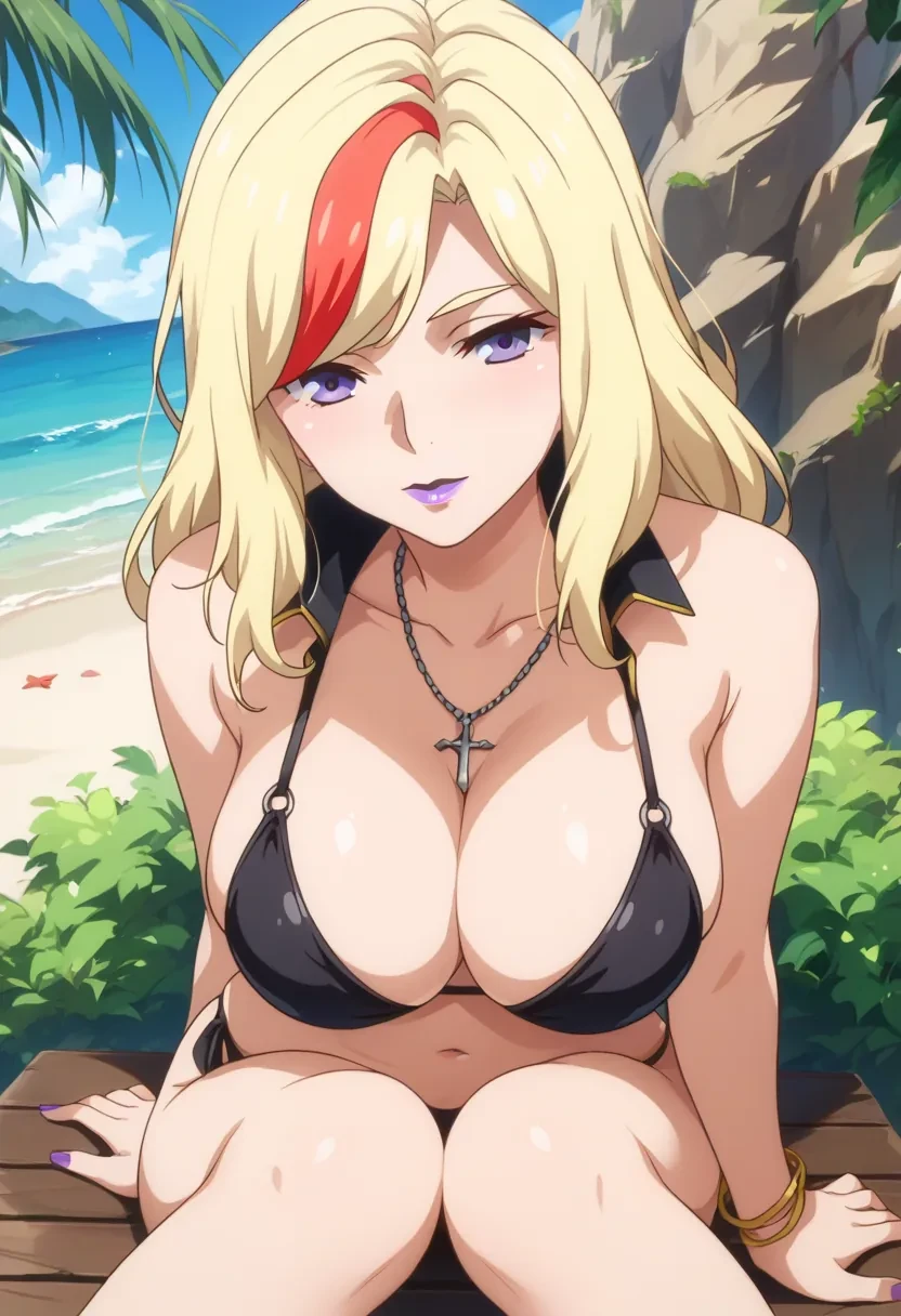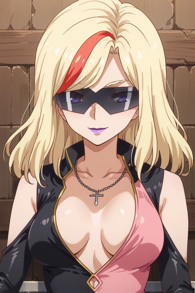 Hasumi Rein, blonde hair, multicolored hair, streaked hair, red hair, purple lips, lipstick, cross necklace,Outfit: