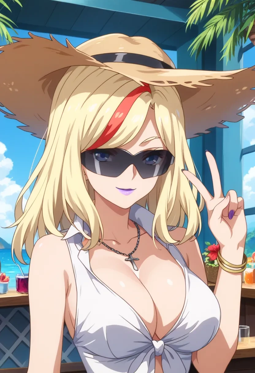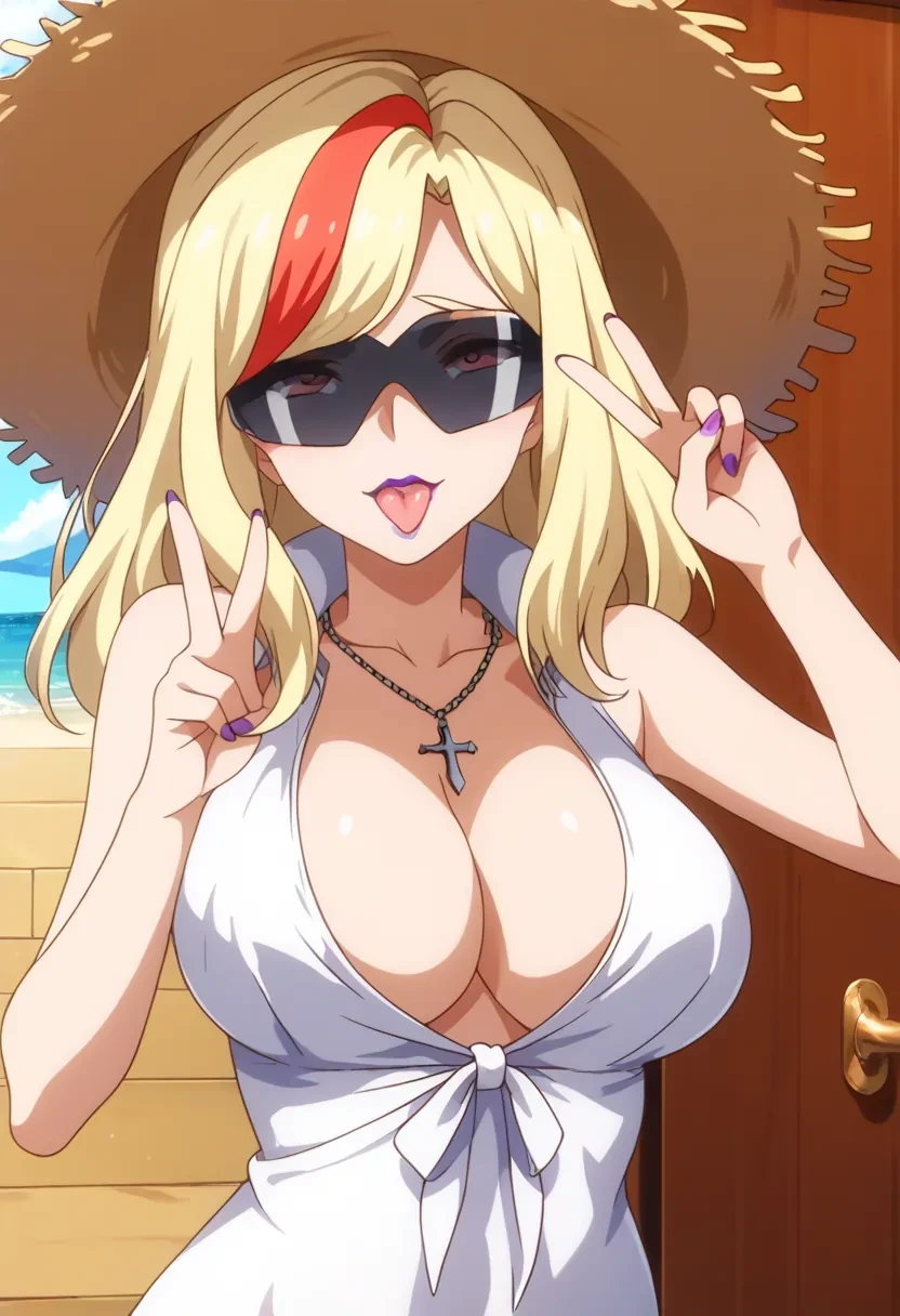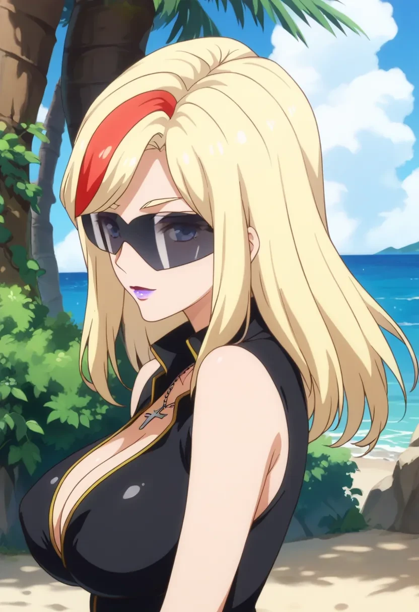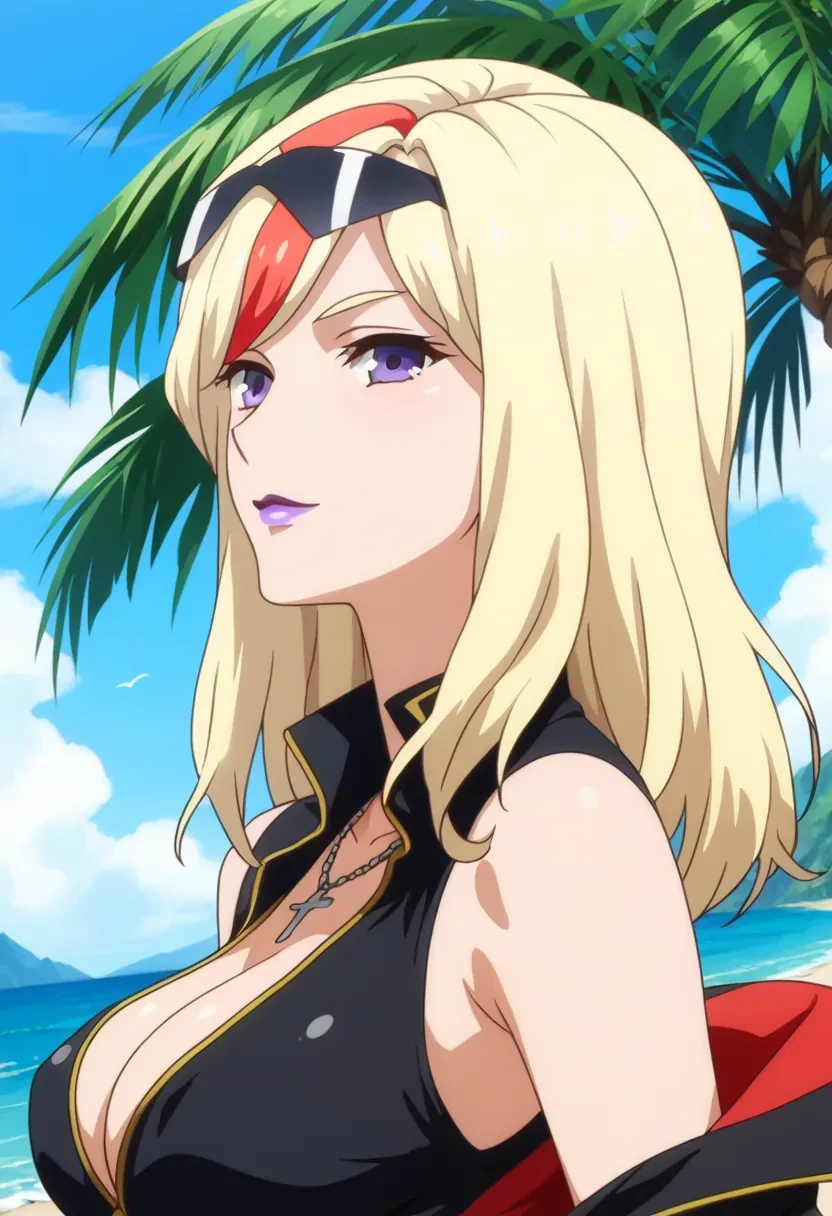 Hasumi Rein, blonde hair, multicolored hair, streaked hair, red hair, purple lips, lipstick, cross necklace,Outfit: