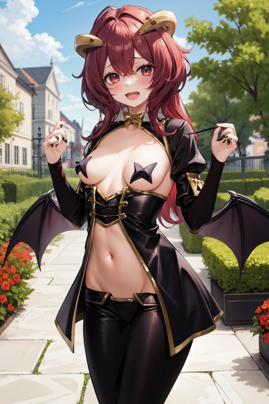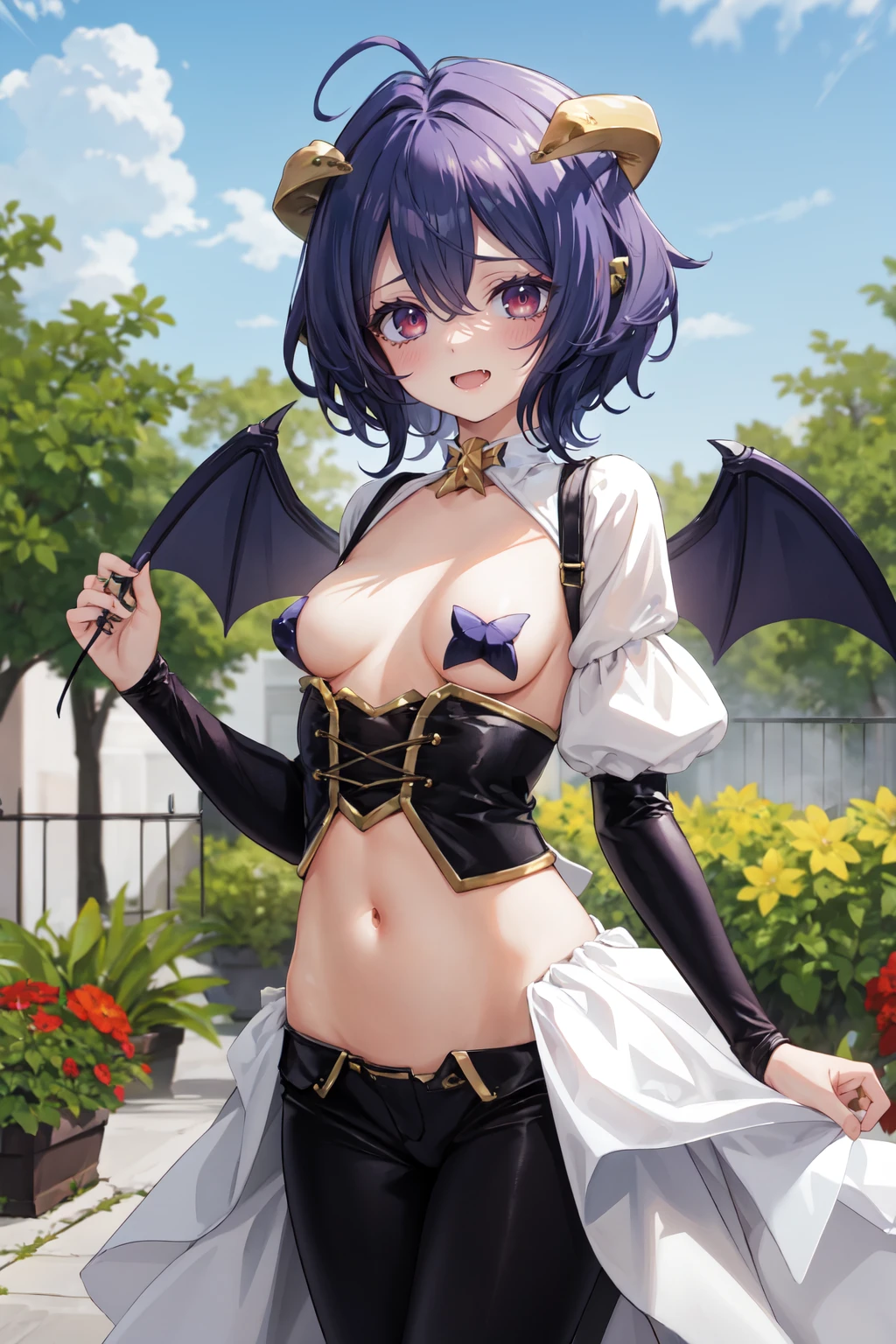 navel,horns,fang,demon horns,demon wings