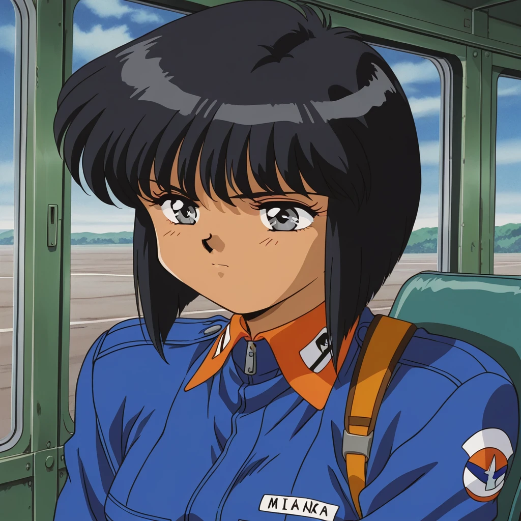 2) arisa mikata, short hair , gray eyes, black hair , tan skin , 1-woman, pilot apparel