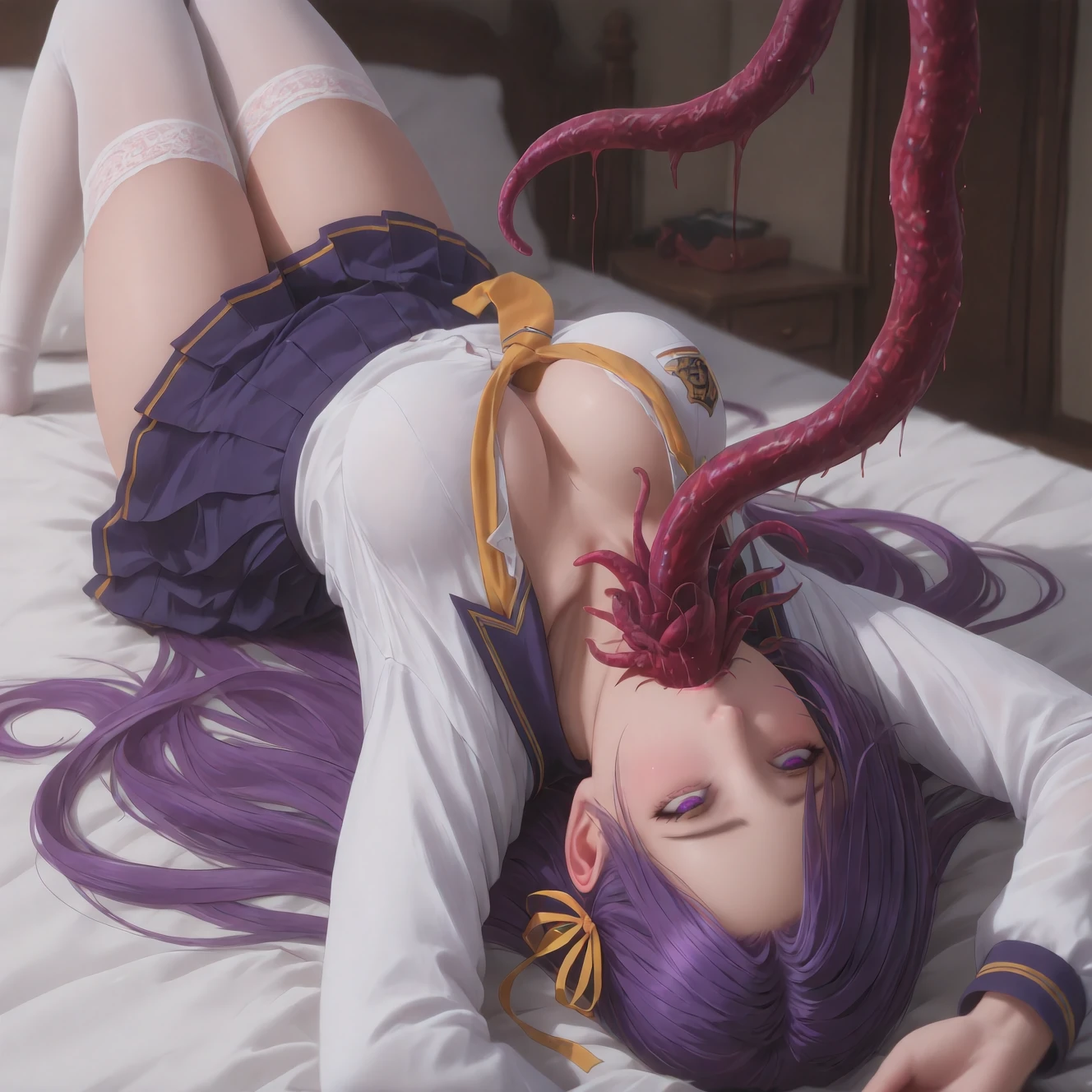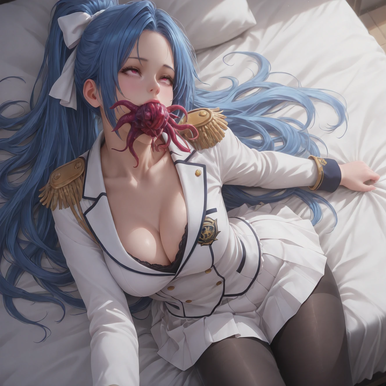 mouth hold,(lying,on bed:1.4),rolling eyes,guro,tentacles,Parasite in mouth,vore,