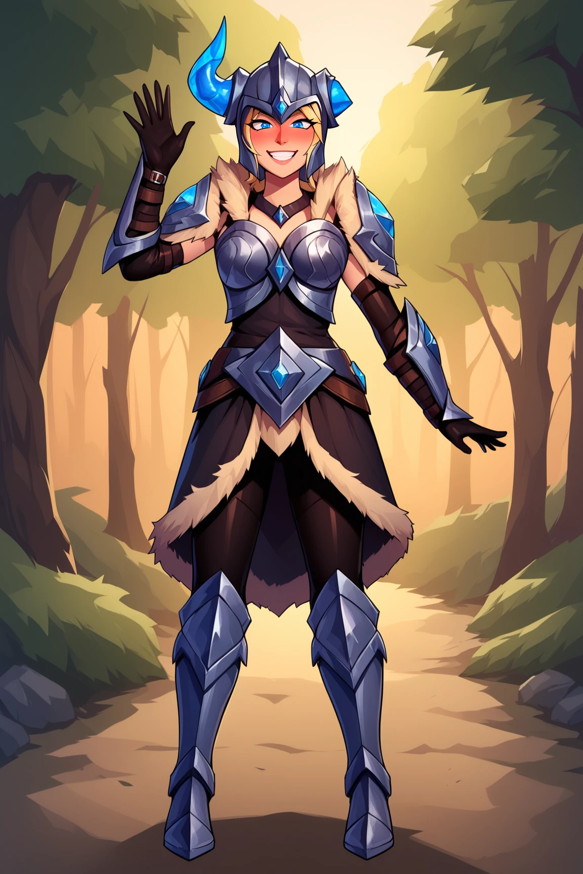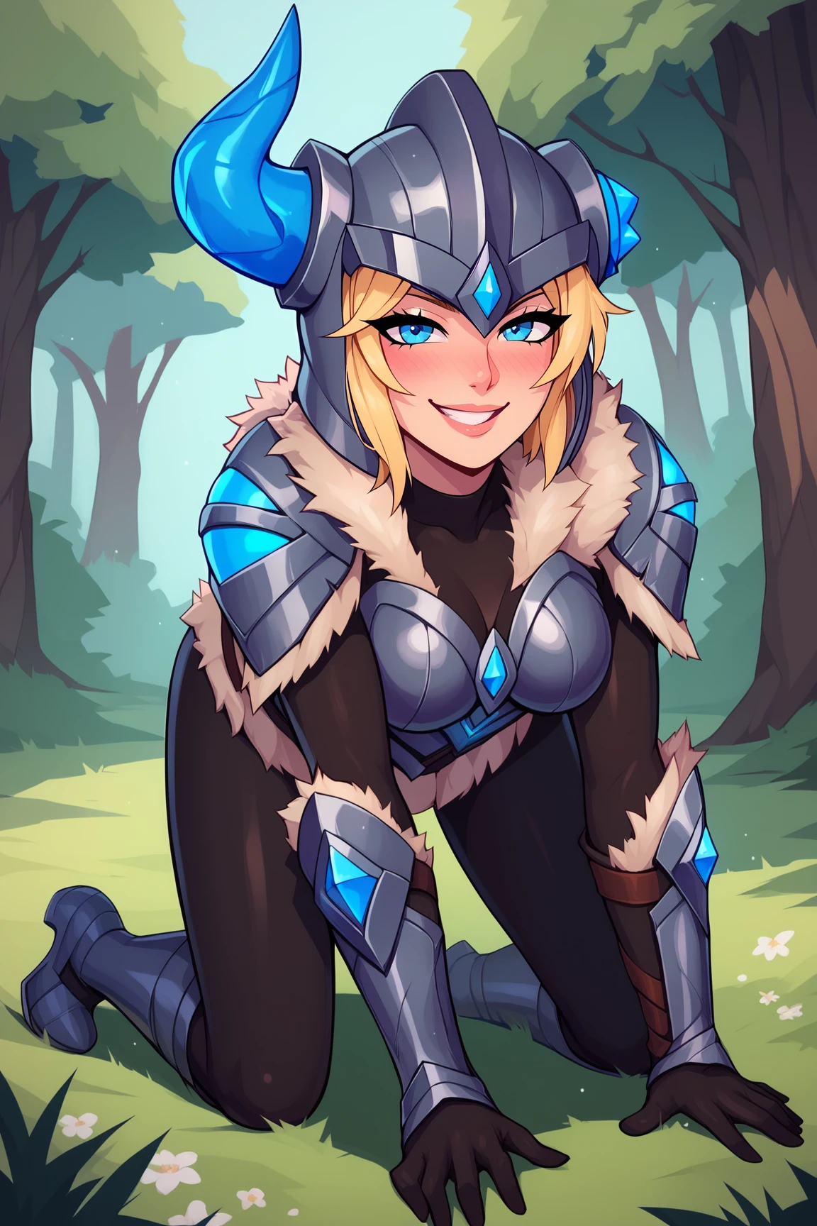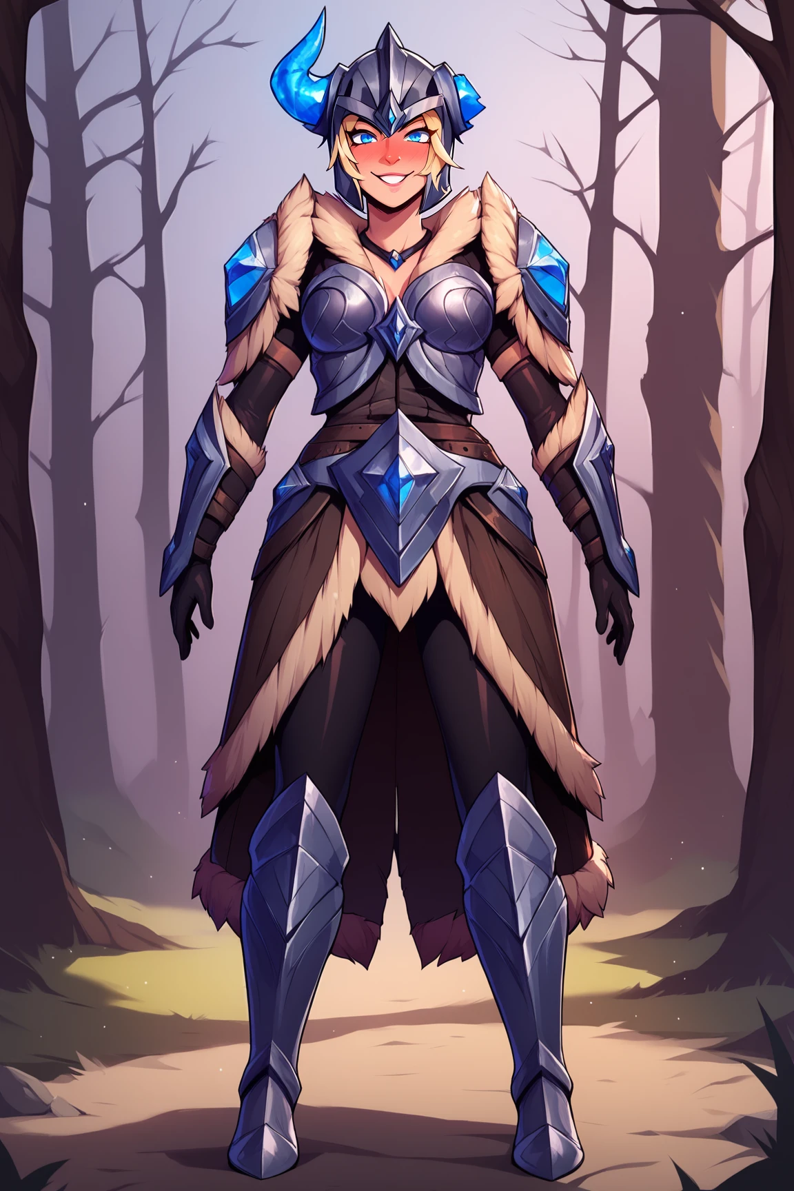 SejuaniLoLXL, blue eyes, blonde hair, short hair, horned helmet, medium breasts, fur trim, armor, black bodysuit, shoulder armor, breastplate, guantlets, black elbow gloves, skirt, black pants, greaves, armored boots