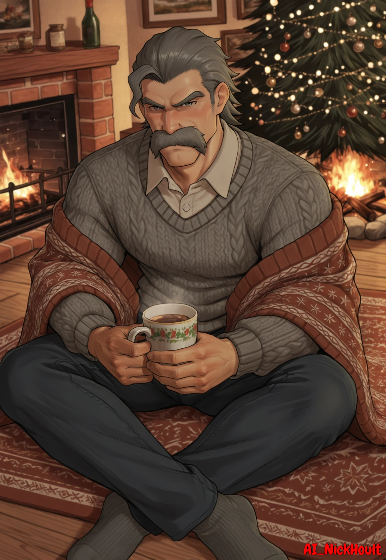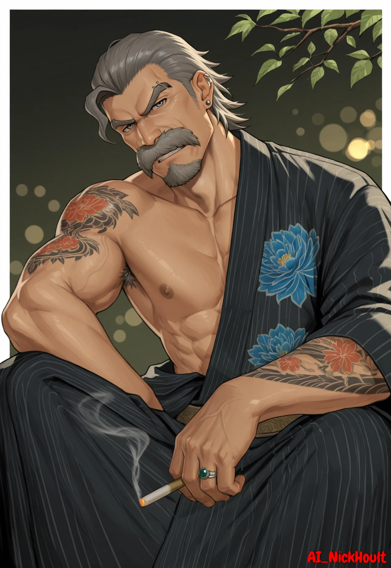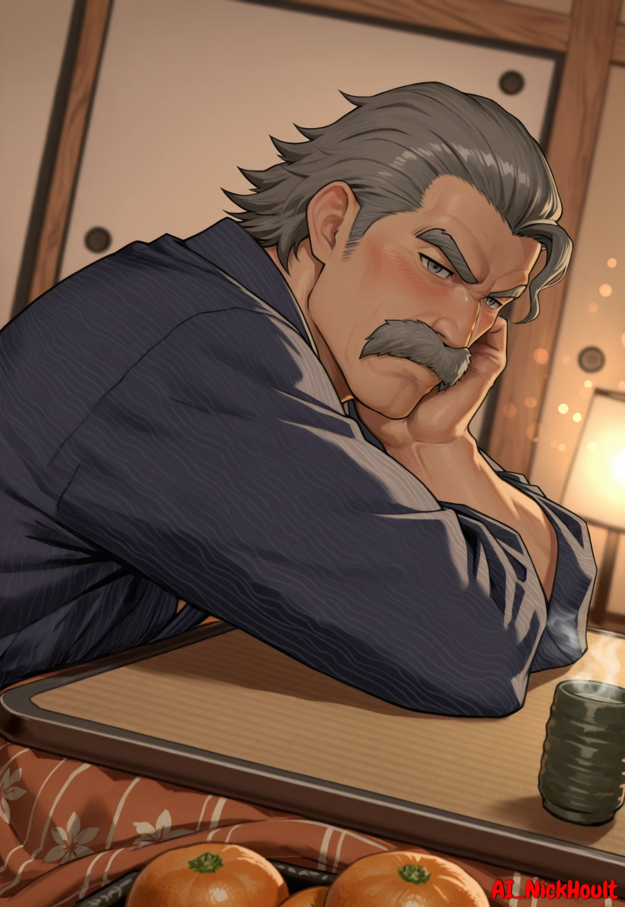 Rodrigo, old man, gray eyes, muscular build, gray hair, short, hair slicked back, facial Hair, bushy mustache, thick eyebrows,