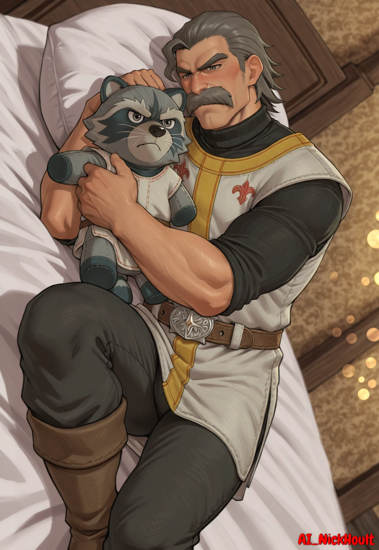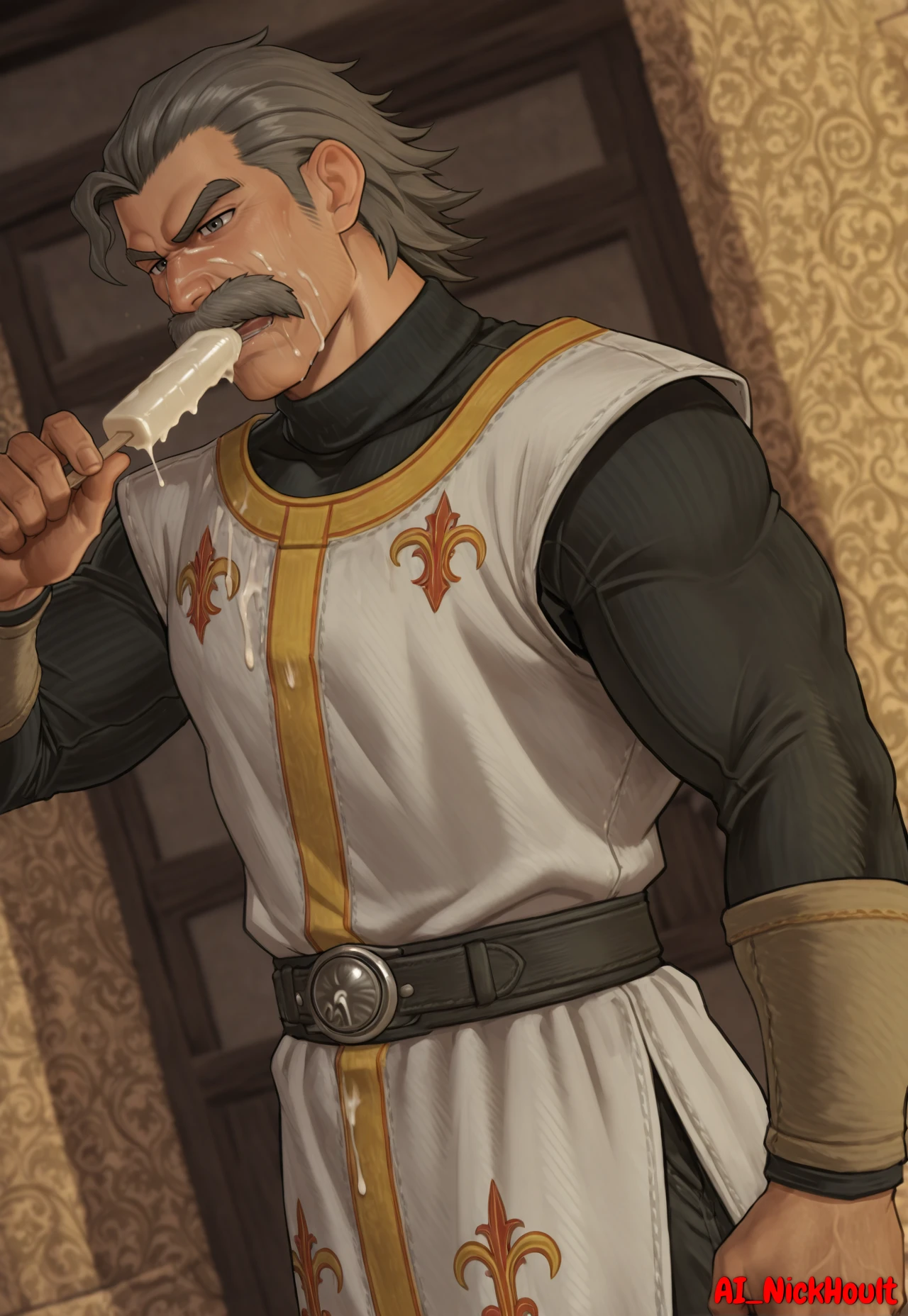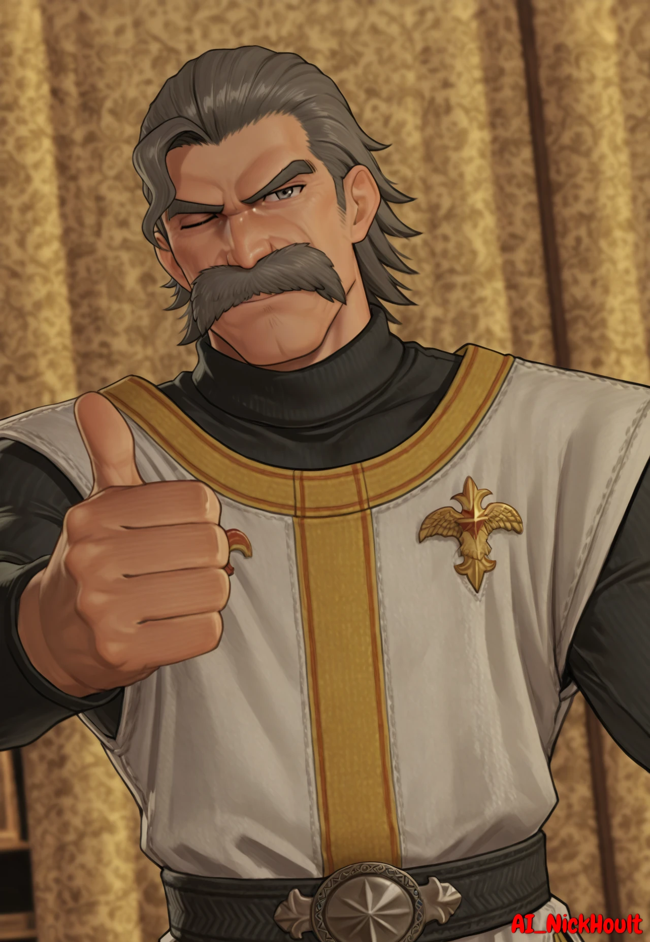 Rodrigo, old man, gray eyes, muscular build, gray hair, short, hair slicked back, facial Hair, bushy mustache, thick eyebrows,White tunic, gold vertical stripes, yellow trim, orange double-headed eagle on the tunic, orange pattern on the chest of the tunic, black turtleneck under a tunic, Black pants, wide brown leather belt, large silver circular buckle, brown leather boots, Description