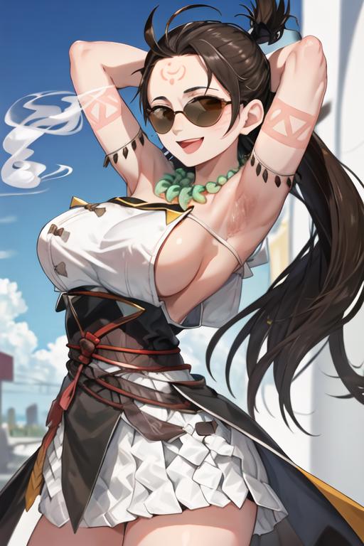 The trigger word is himiko_fgo, and the recommended tags are best quality, masterpiece, highres, solo, {himiko_fgo:1.15}, long_hair, brown_hair, facial_mark, forehead_mark, breasts, forehead, topknot, twintails, body_markings, jewelry, large_breasts, necklace, brown_eyes, magatama, magatama_necklace, blush, smile, sideboob, armpits, open_mouth, arms_up.