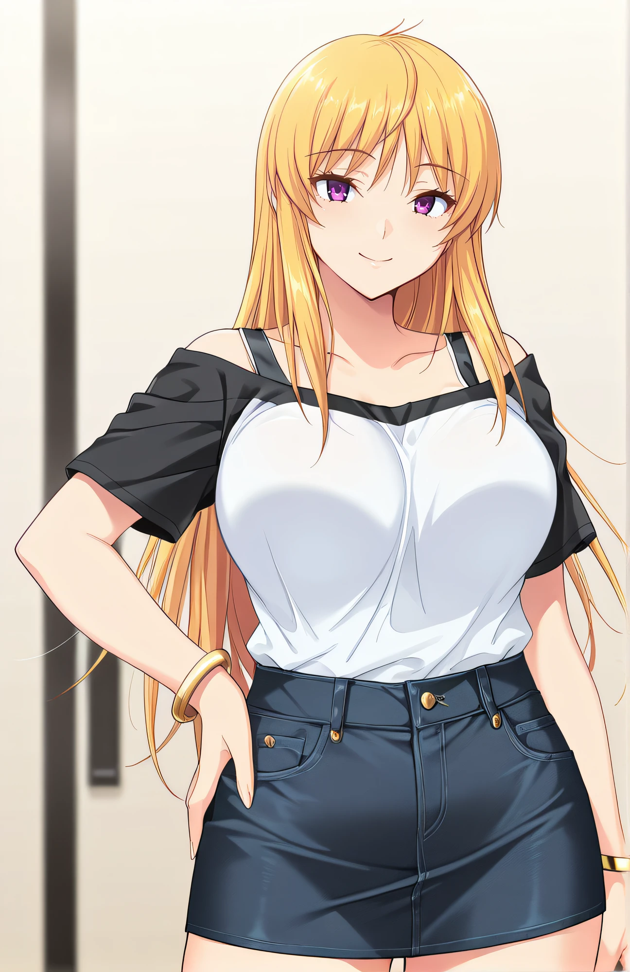 off shoulder, two tone shirt, black straps, very short sleeves, golden bracelet, denim skirt