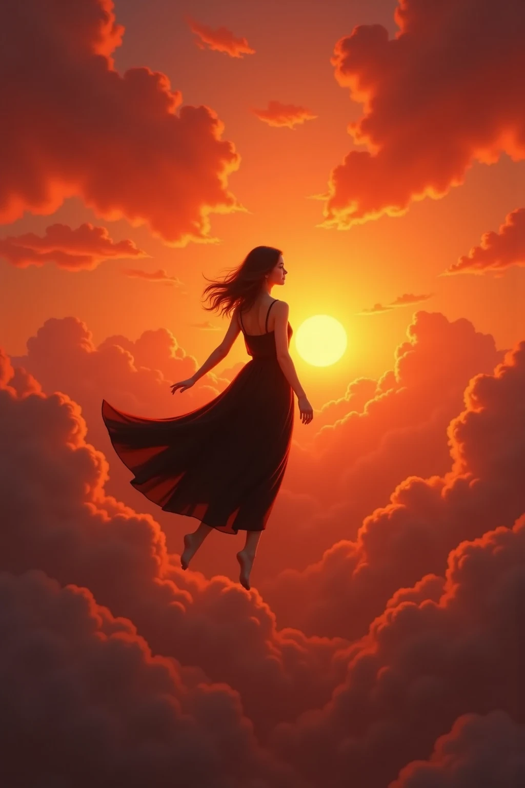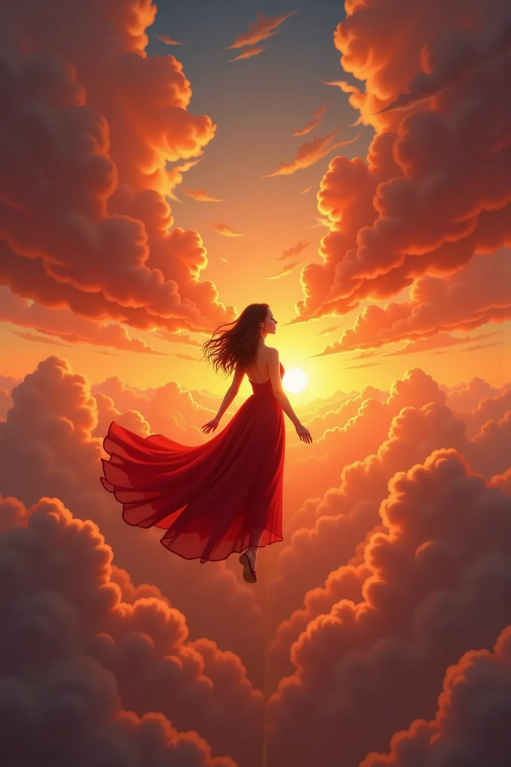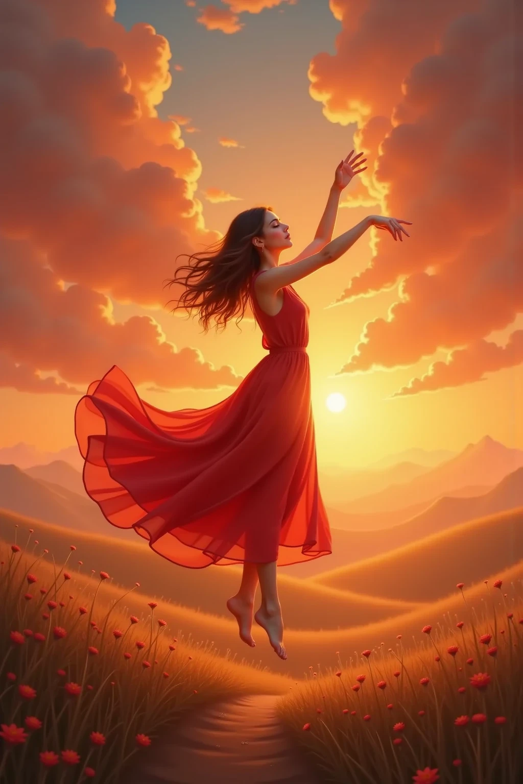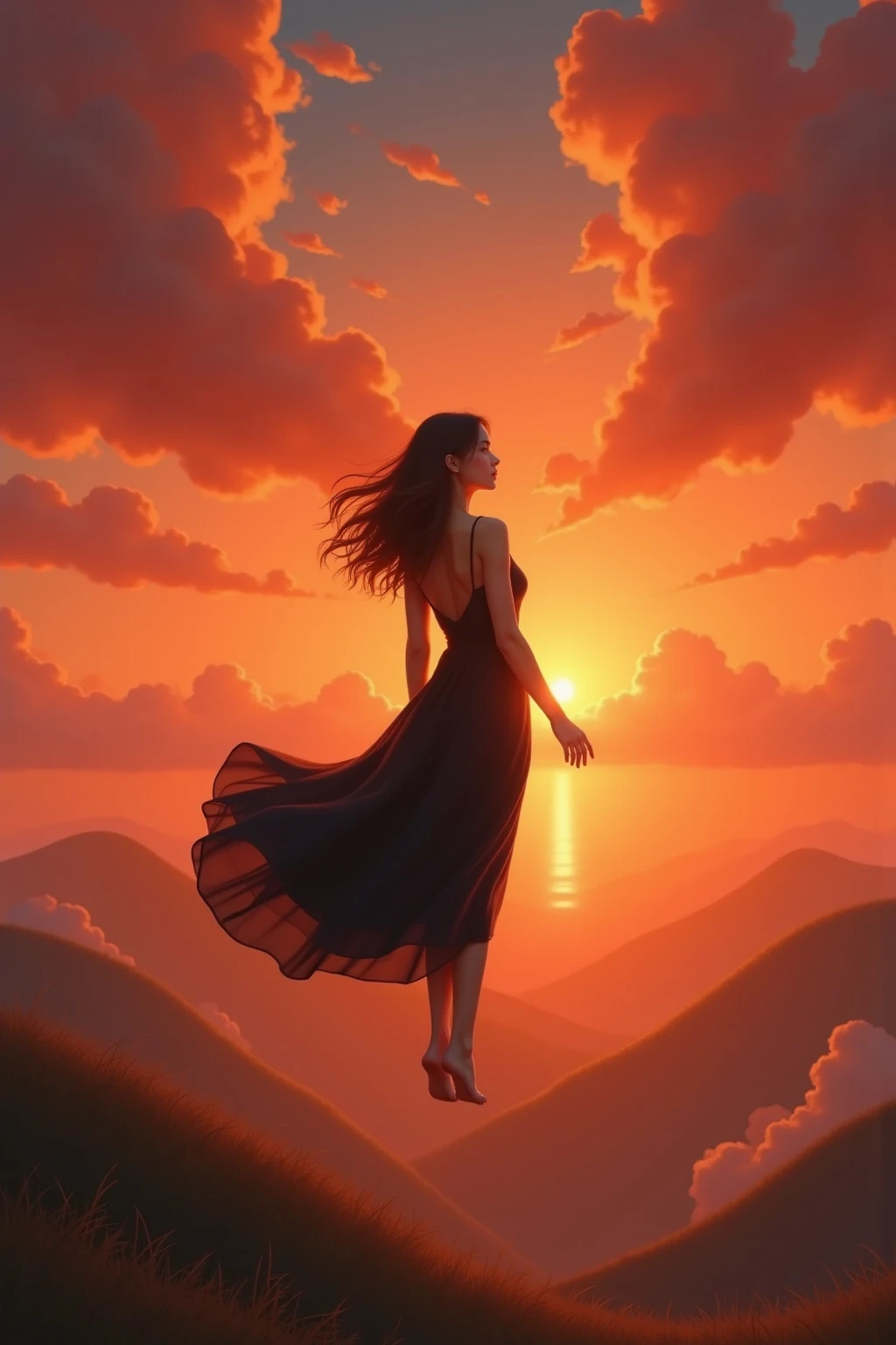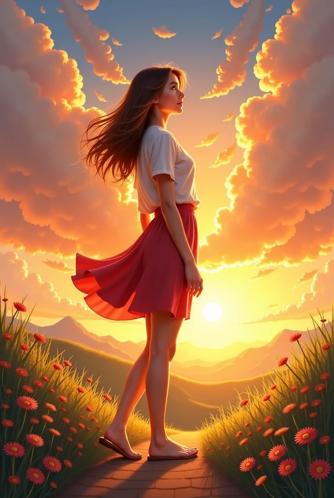 (傑作, 最高品質:1.2), 1girl,夕日の美しい茜空に照らされた草原の中に立つ人物。幻想的な風景。花と丘に囲まれた小道に立つ女性を描いています。燃えるようなオレンジ色の空が鮮やかにグラデーションに広がる。空にはドラマチックな雲が広がり、沈みゆく太陽が風景に温かみのある光を投げかけています。