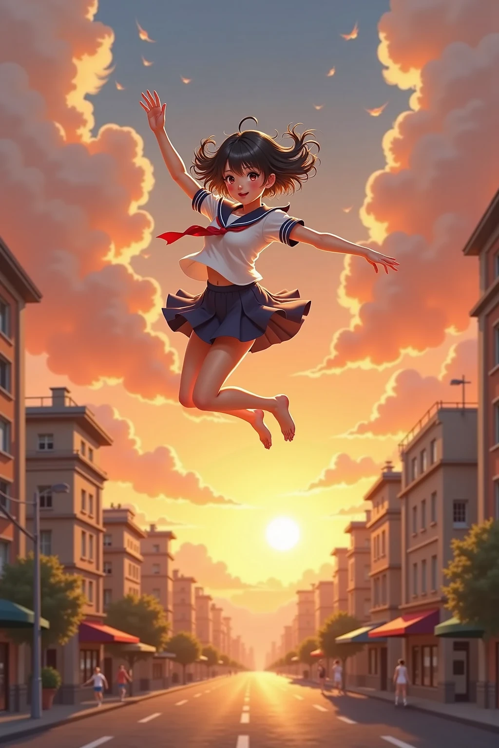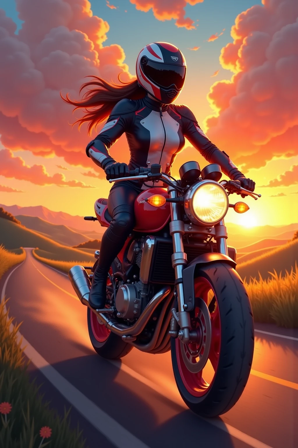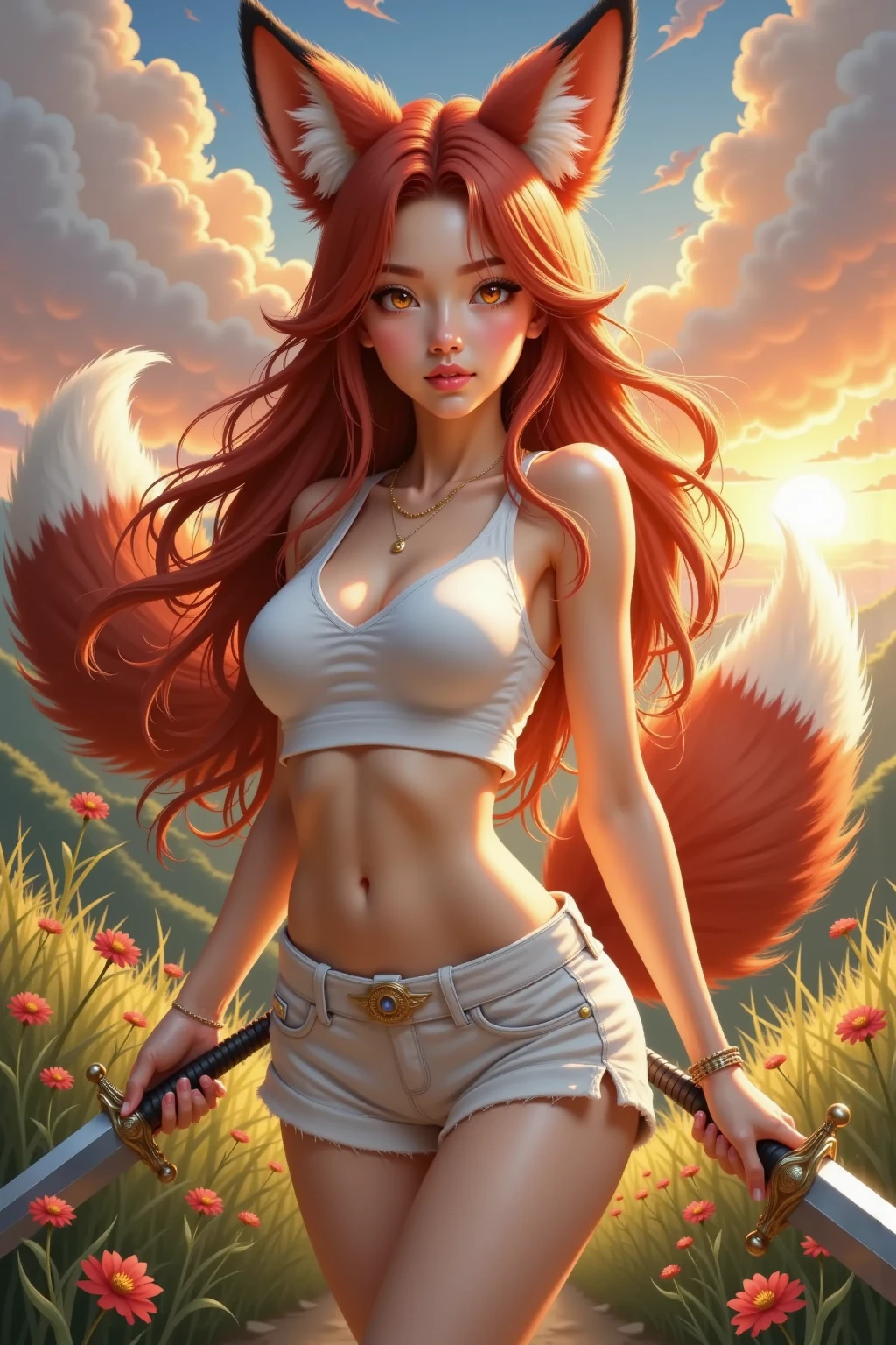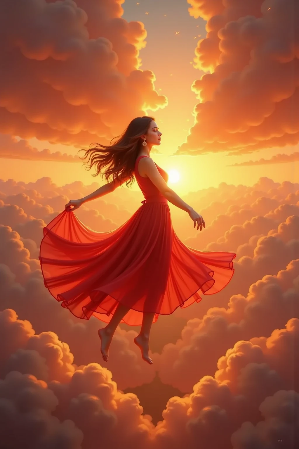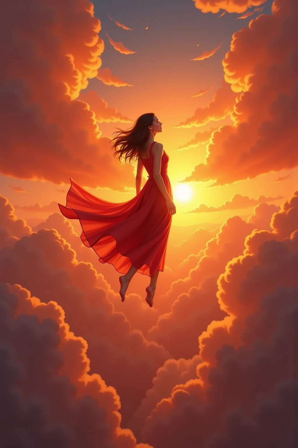 (傑作, 最高品質:1.2), 1girl,夕日の美しい茜空に照らされた草原の中に立つ人物。幻想的な風景。花と丘に囲まれた小道に立つ女性を描いています。燃えるようなオレンジ色の空が鮮やかにグラデーションに広がる。空にはドラマチックな雲が広がり、沈みゆく太陽が風景に温かみのある光を投げかけています。