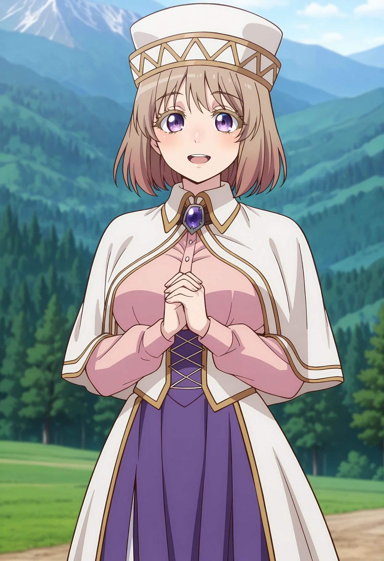 white headwear, white capelet, brooch, pink shirt, long sleeves, white corset, overskirt, long skirt, purple skirt