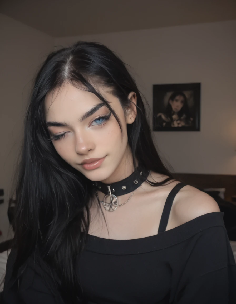 adding to prompt ' fake eyelashes, black hair, goth, pale blue eyes, wolf cut, small squinted eyes, slim jaw, slim chin, thick wavy hair, eyeliner ' seems to give better results than just the lora.