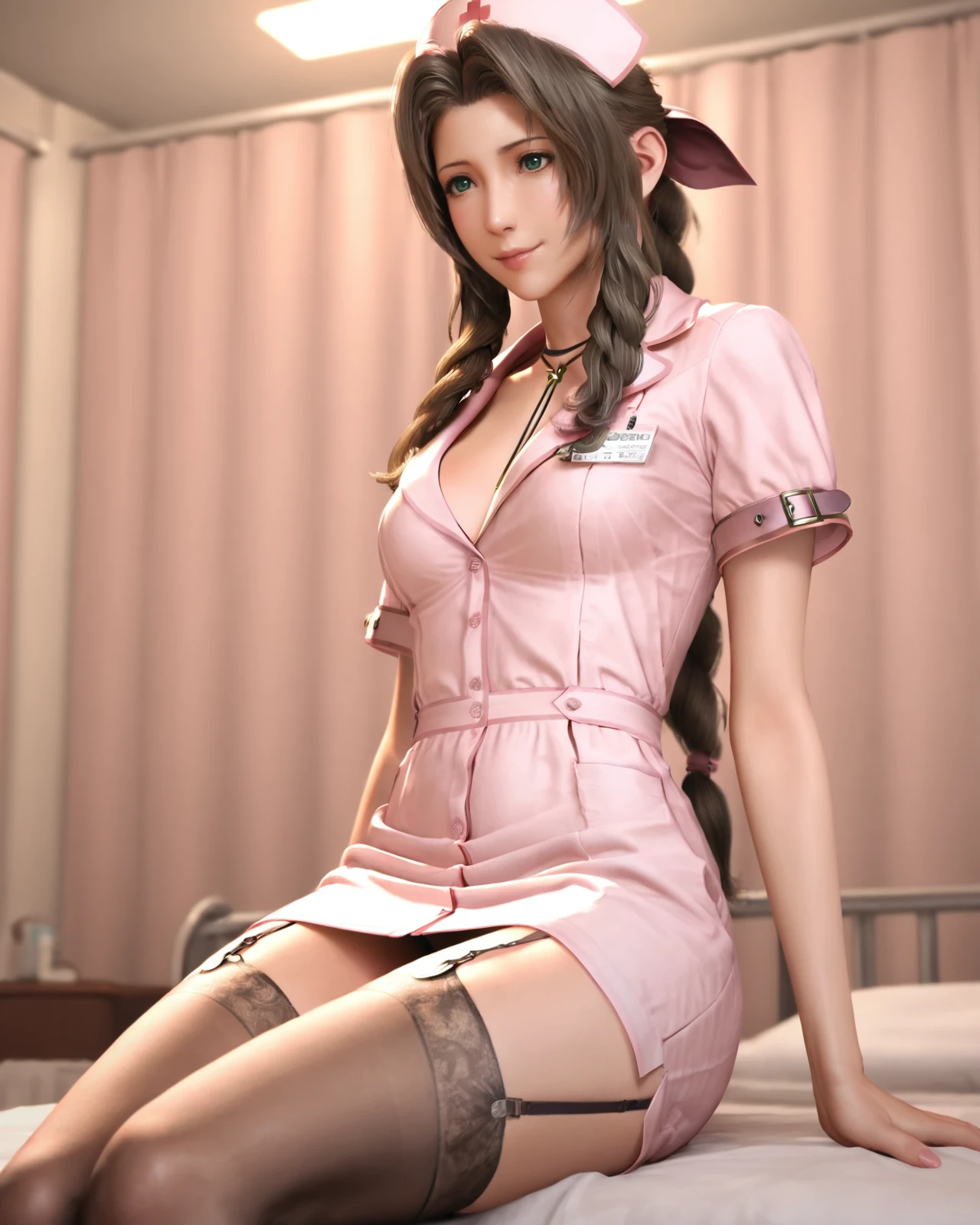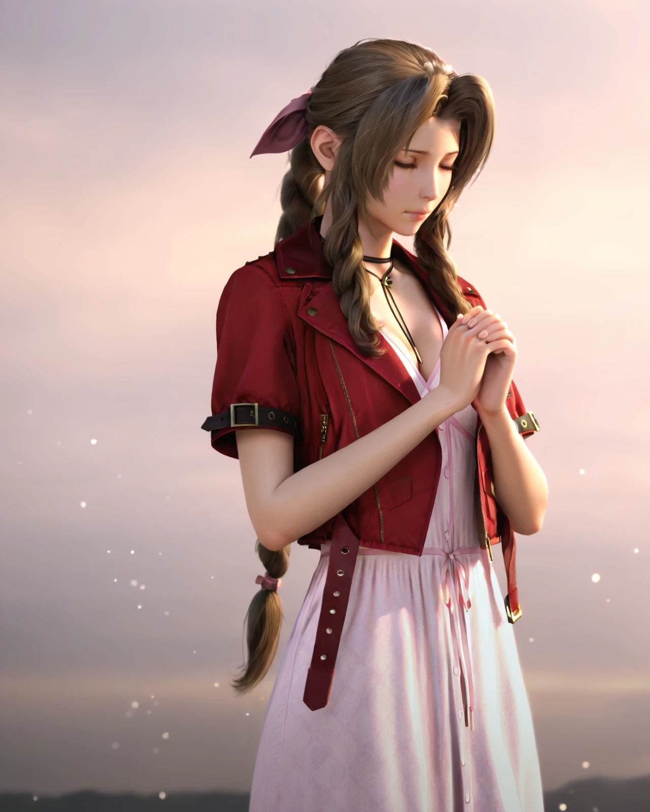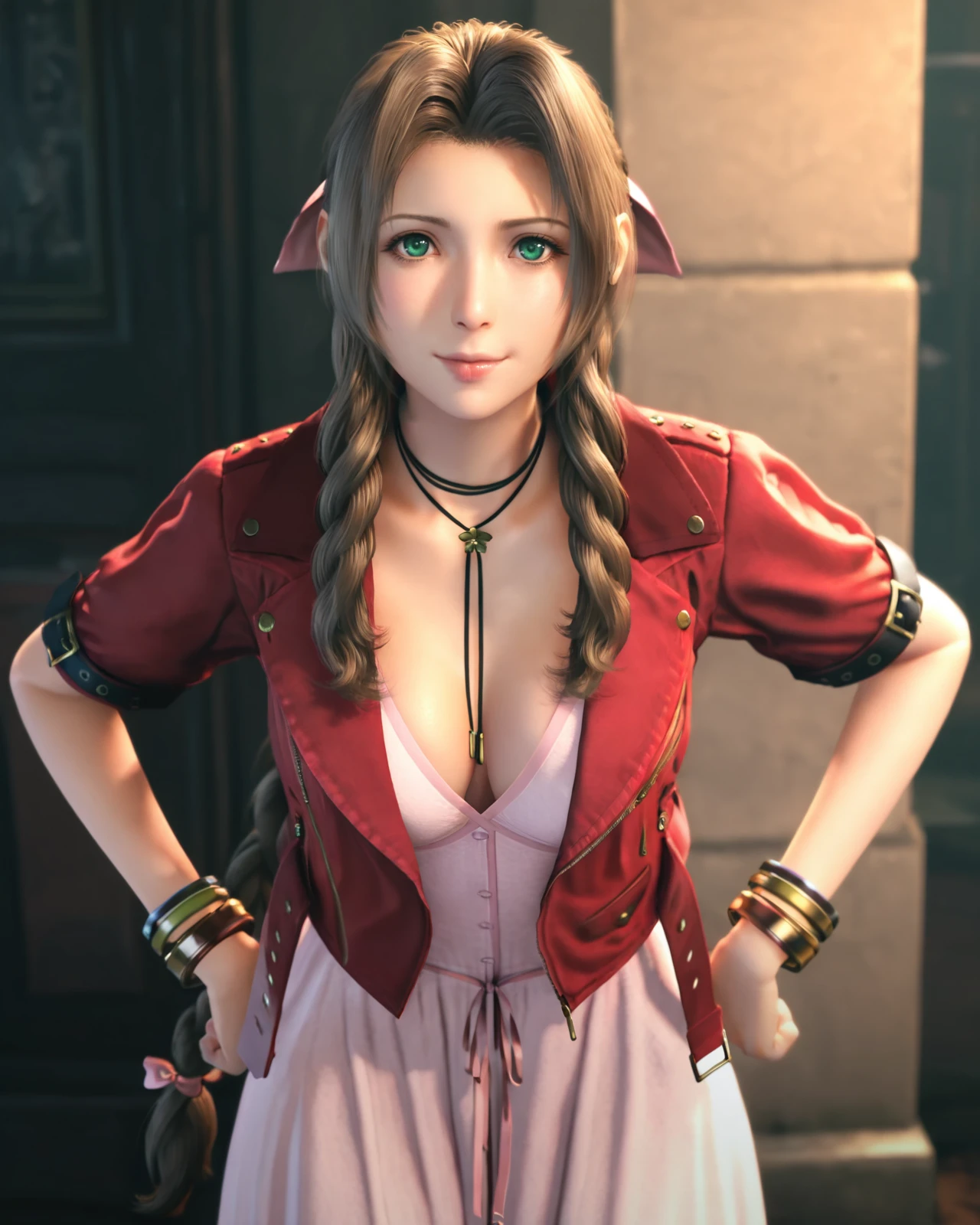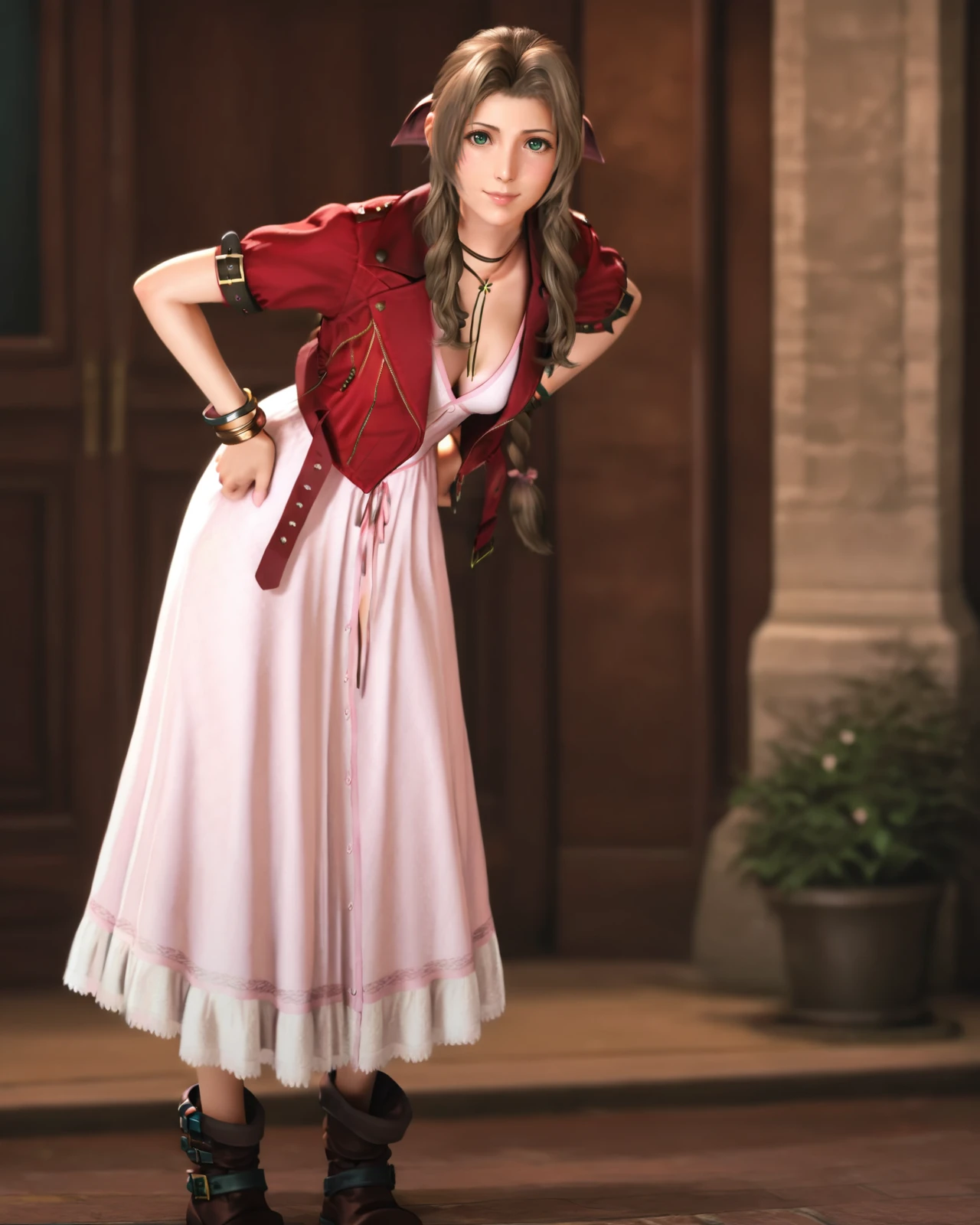Aerith, 1girl, solo, long hair, brown hair, medium breasts, green eyes, realistic,