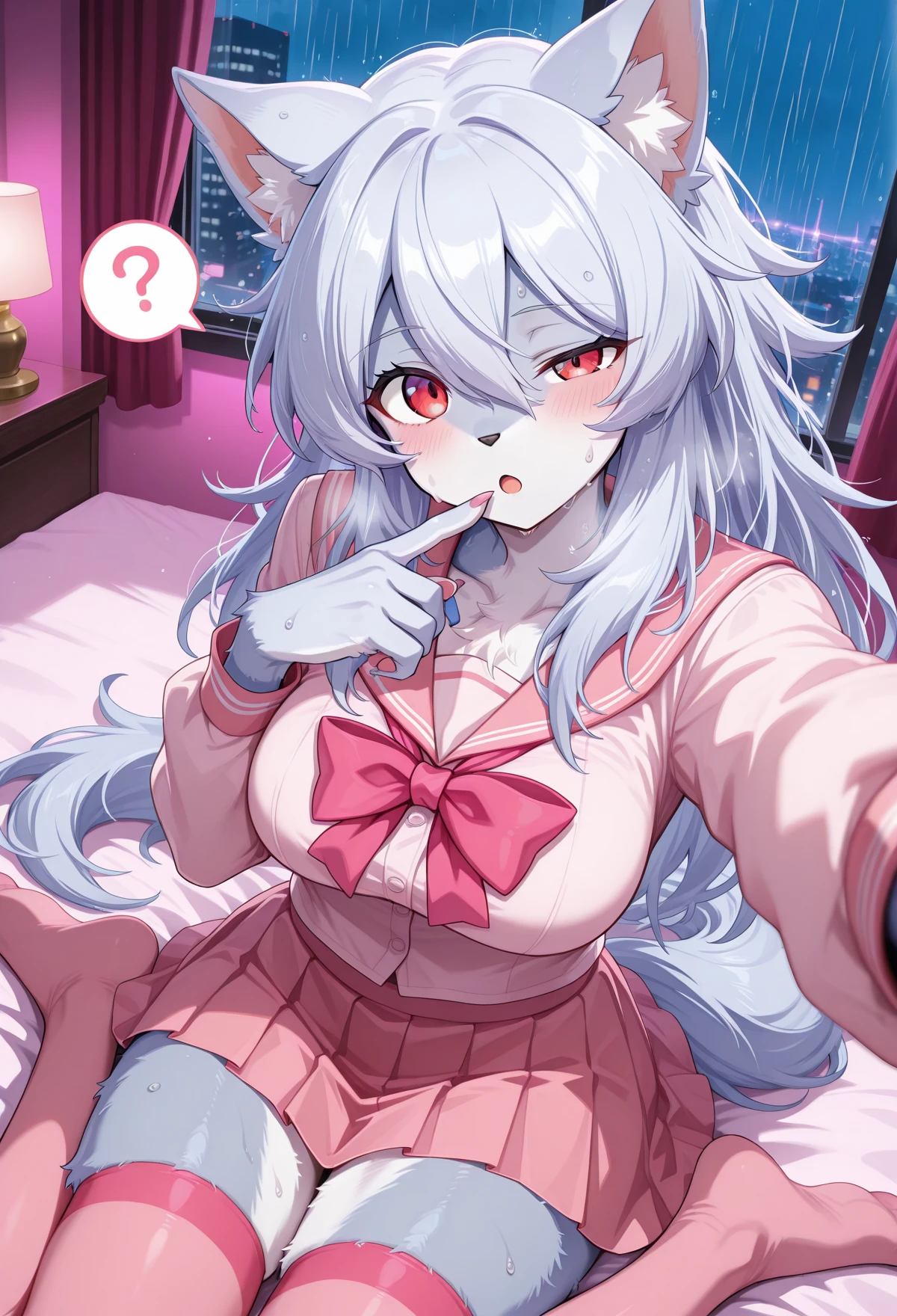 1 girl,furry, animal ears, fur breast,long hair, tail,monster girl,fur skin,sliver fur,colored skin,furry female, furry, wolf tail, wolf ears, breasts,, wolf girl, white hair, silver hair, claws, pink bow, jewelry, red gem, hair between eyes, fur,pawpads,
