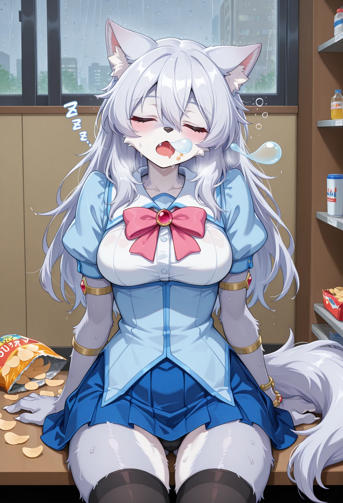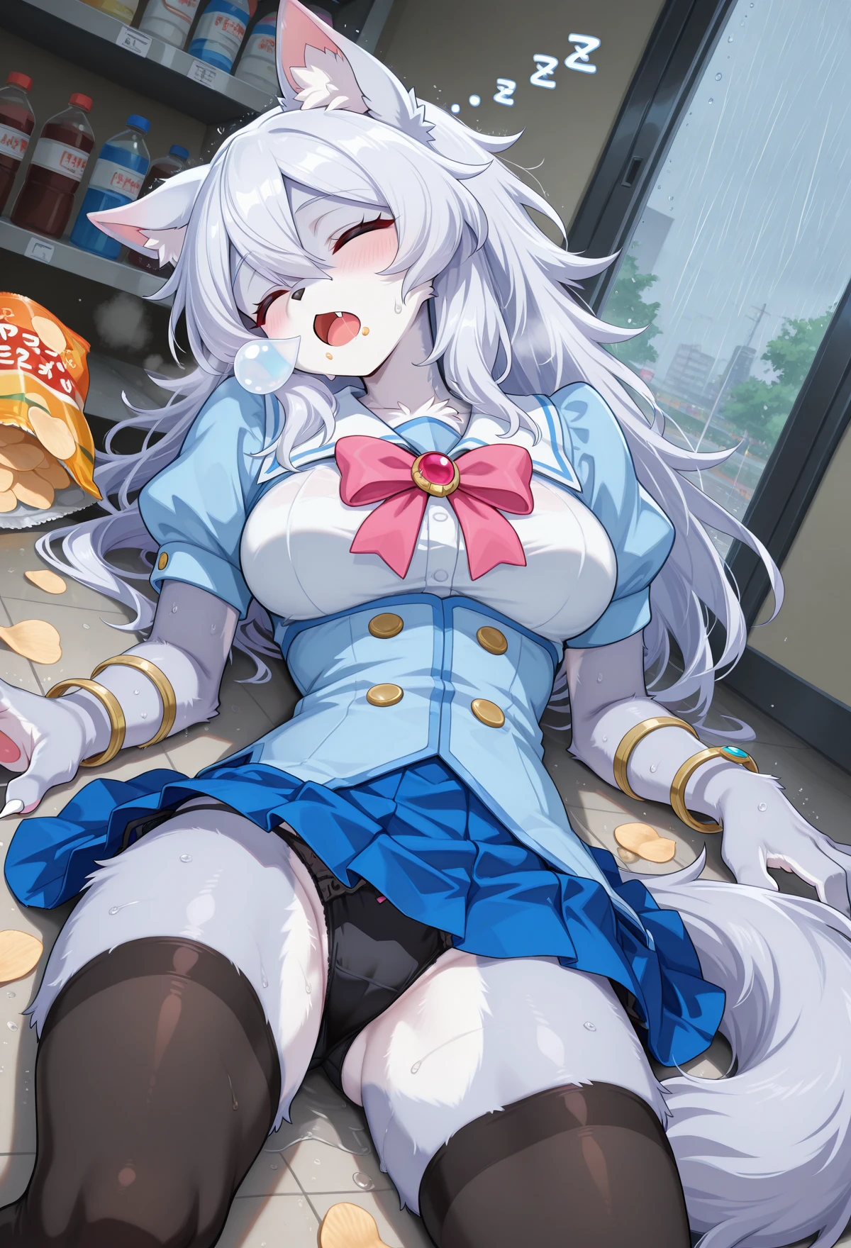 1 girl,furry, animal ears, fur ,long hair, tail,monster girl,fur skin,sliver fur,colored skin,furry female, furry, wolf tail, wolf ears, breasts,, wolf girl, white hair, silver hair, claws, pink bow, jewelry, red gem, hair between eyes, fur,pawpads,pale blue skin,unconscious,dangling arms black thighhighs, brown shoes, bracelet, armlet, brooch, belly belt, short sleeves, white collar, blue corset ,blue skirt,grey tongue,zombification,blank eyes,grey skin,head tilt,empty eyes,tears,no pupils,tongue out,saliva,torn clothes,,torn skirt,wound,uneven eyes,...,zombie pose,grey eyes,grey , through clothes,
