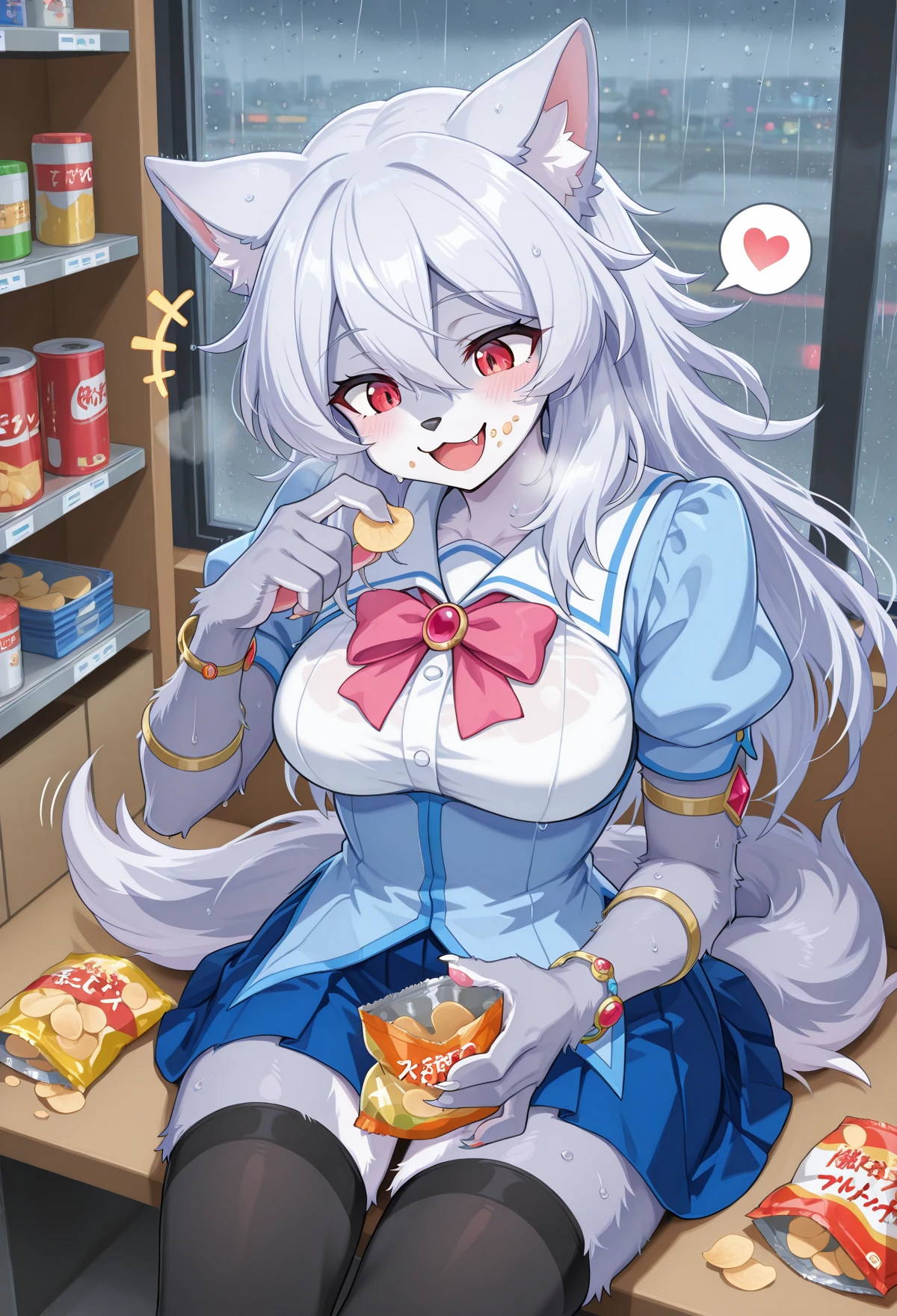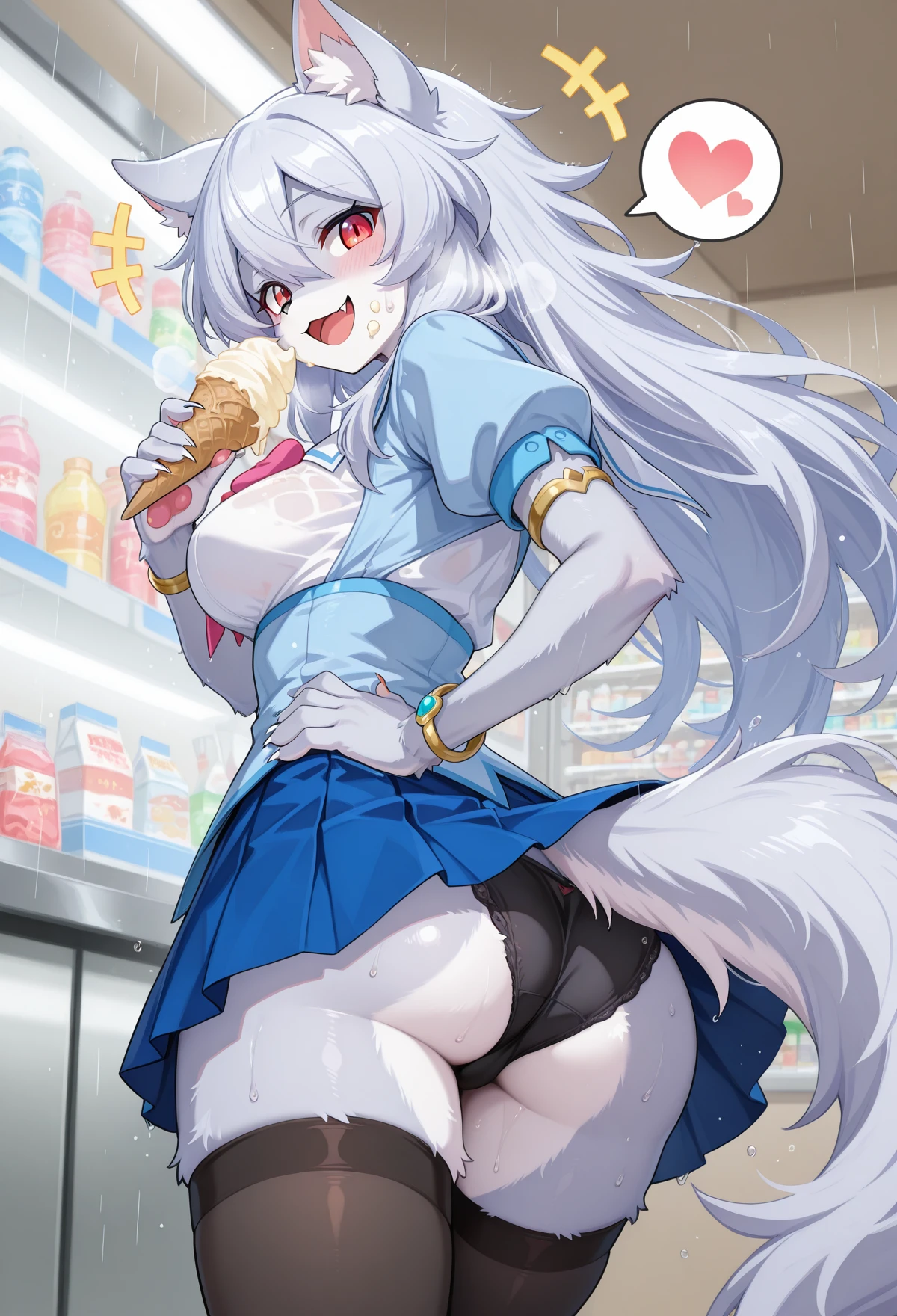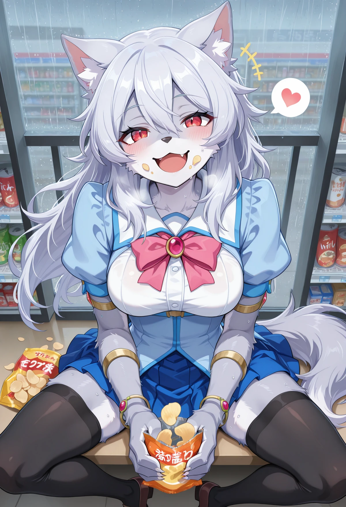 Leona_MGR, 1girl, animal ears, long hair, tail, furry female, furry, wolf tail, wolf ears, breasts, black thighhighs, wolf girl, silver hair, claws, pink bow, jewelry, red gem, brown shoes, hair between eyes, fur, bracelet, armlet, brooch, belly belt, short sleeves, white collar, blue corset, pawpads,pubic tattoo,demon tail, fur tail, back wings, pink eyes, glowing eyes, fang, purple tongue, demon horns, demon girl, large breasts, pink fur, purple colored skin,blue skin,furry,purple skin,purple nipples,blue skirt,colored skin, pink hair, sharp nails, corruption