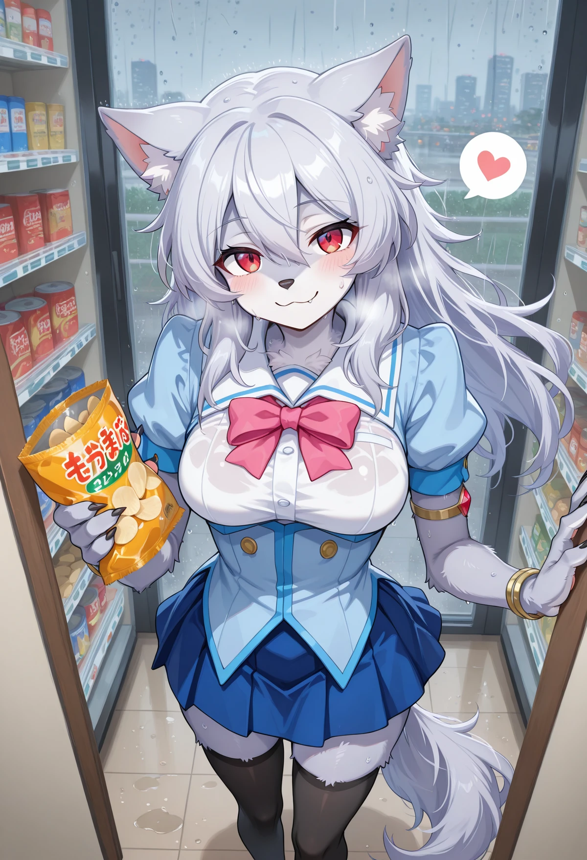 1girl, animal ears, red eyes, long hair, tail,monster girl,fur skin,sliver fur,colored skin,furry female, furry, wolf tail, wolf ears, breasts,, wolf girl, white hair, silver hair, claws, pink bow, jewelry, red gem, hair between eyes, fur,pawpads,pale blue skin
