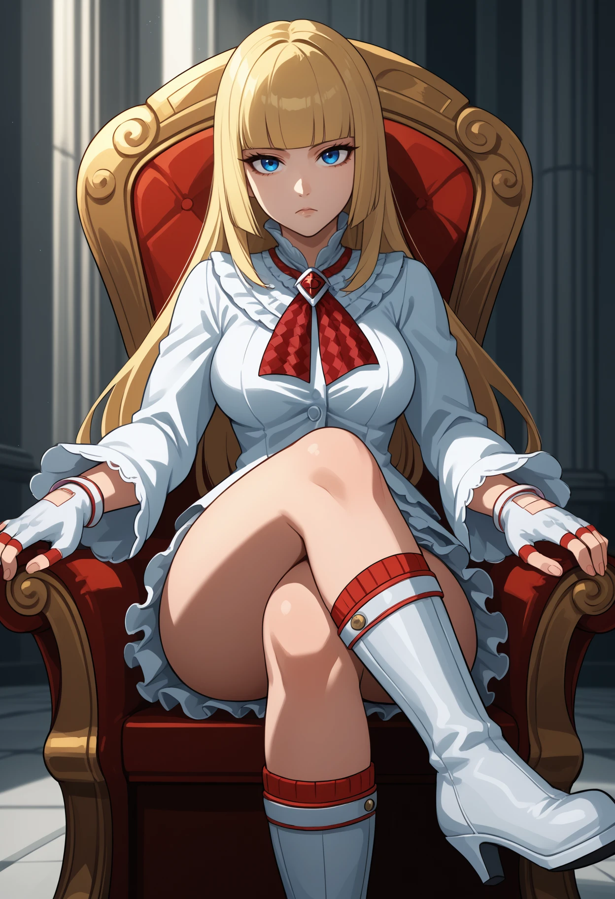 frills, white dress, frilled dress, red ascot, long sleeves, white gloves, fingerless gloves, white footwear, knee boots, high heel boots