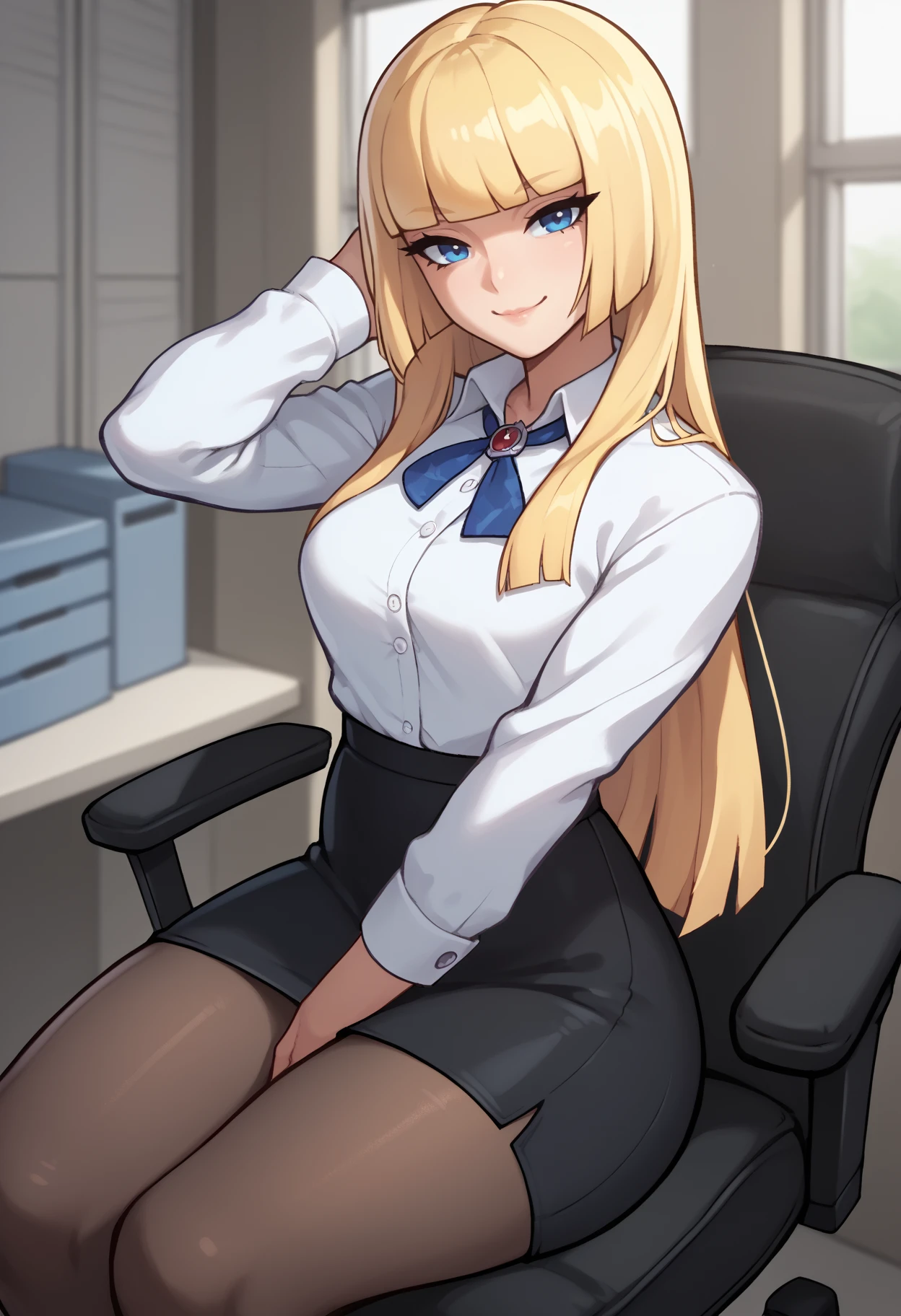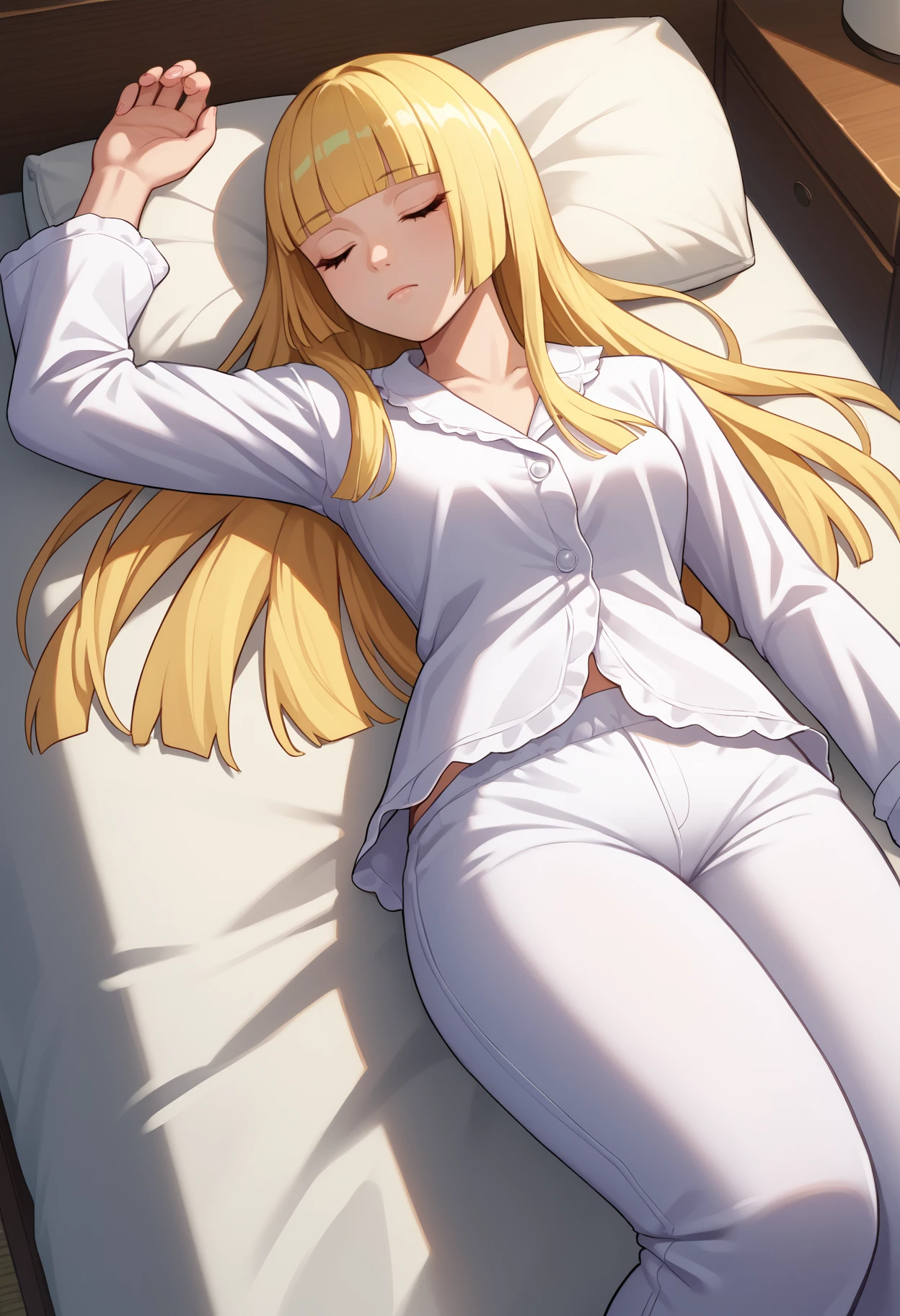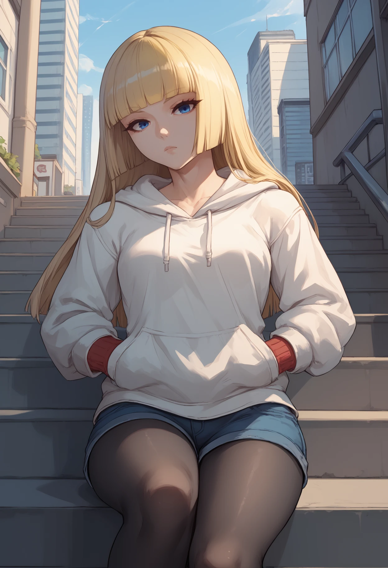 emilieog, long hair, blonde hair, blunt bangs, hime cut, blue eyes