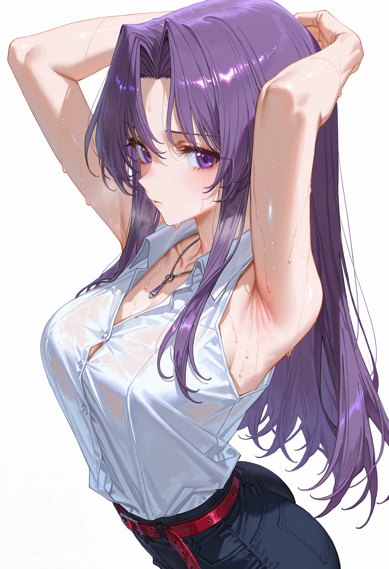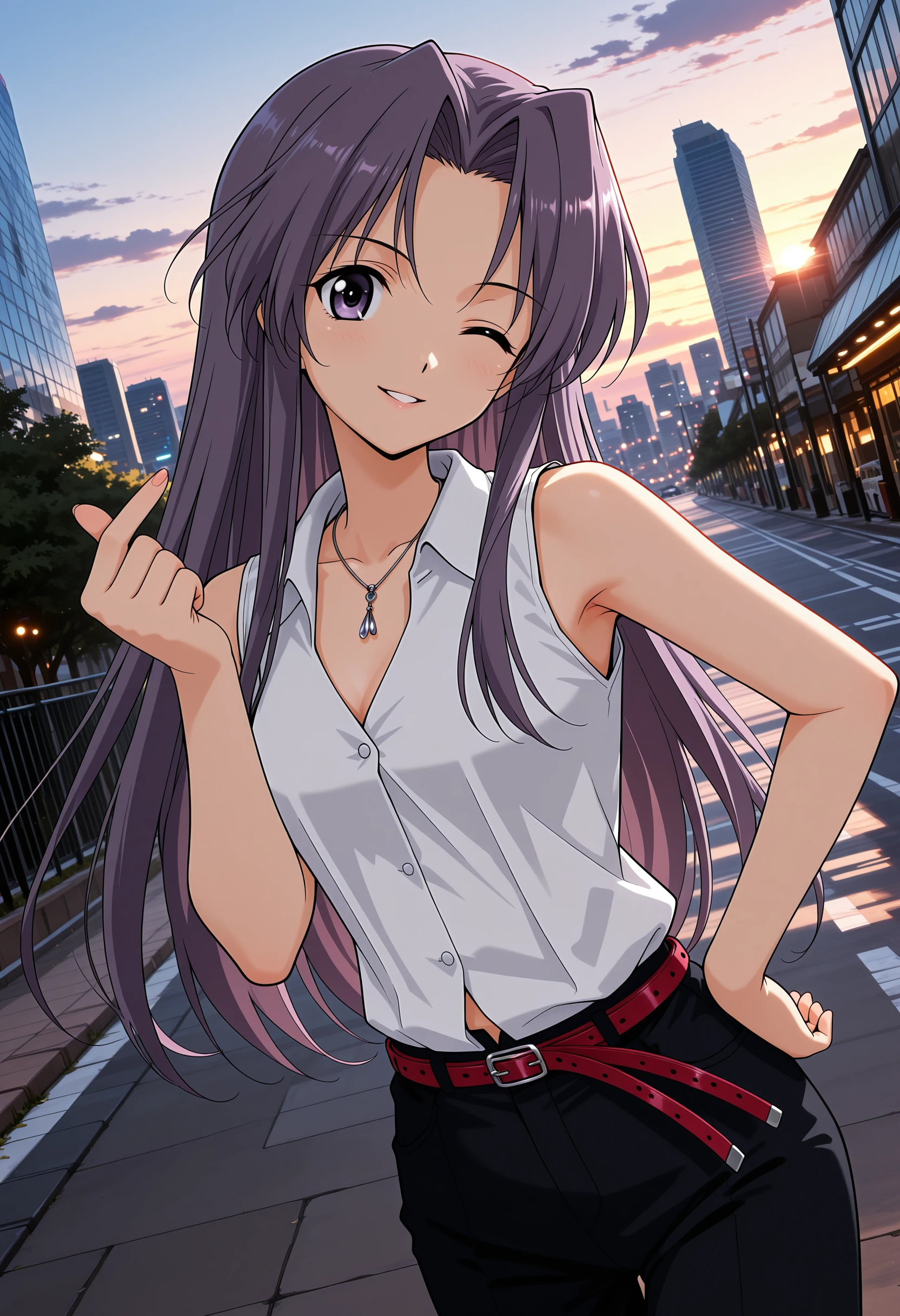 kirishima koyomi \(memories off 3\), koyomi3, white sleeveless dress shirt, wing collar, bare shoulders, belt buckle, red belt, dark pants, hair down, silver pendant,