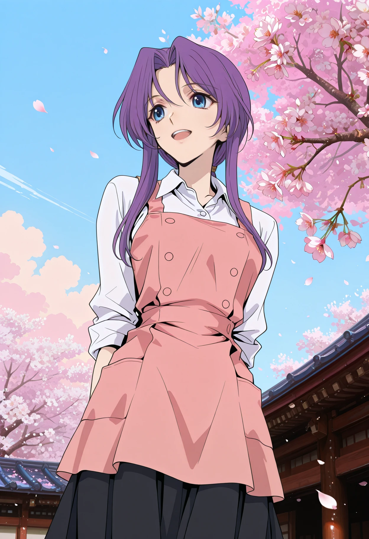 kirishima koyomi \(memories off 1\), koyomiapron, pink apron, white collared shirt, sleeves rolled up, 6buttons on apron, black pleated skirt, low ponytail, blue eyes,