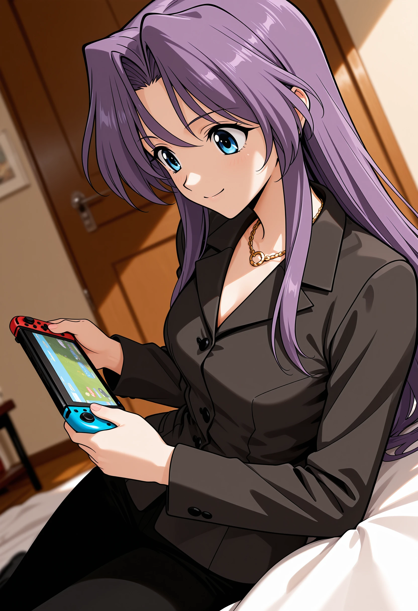 kirishima koyomi \(memories off 1\), koyomiblazer, black blazer, golden necklace, hair down, black pants, blue eyes,