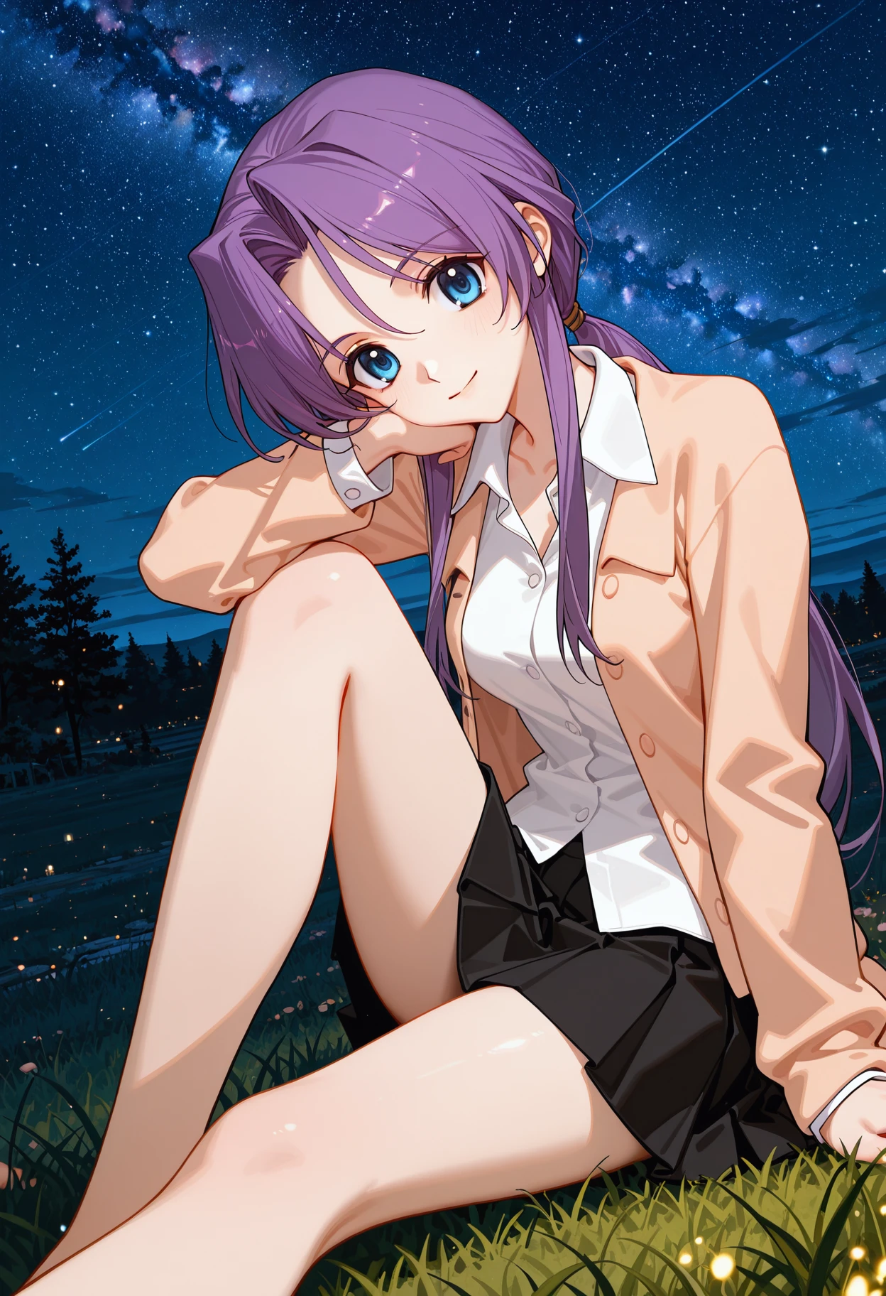 kirishima koyomi \(memories off 1\), koyomicardigan, peach cardigan, open cardigan, white collared shirt, black pleated skirt, low ponytail, blue eyes,