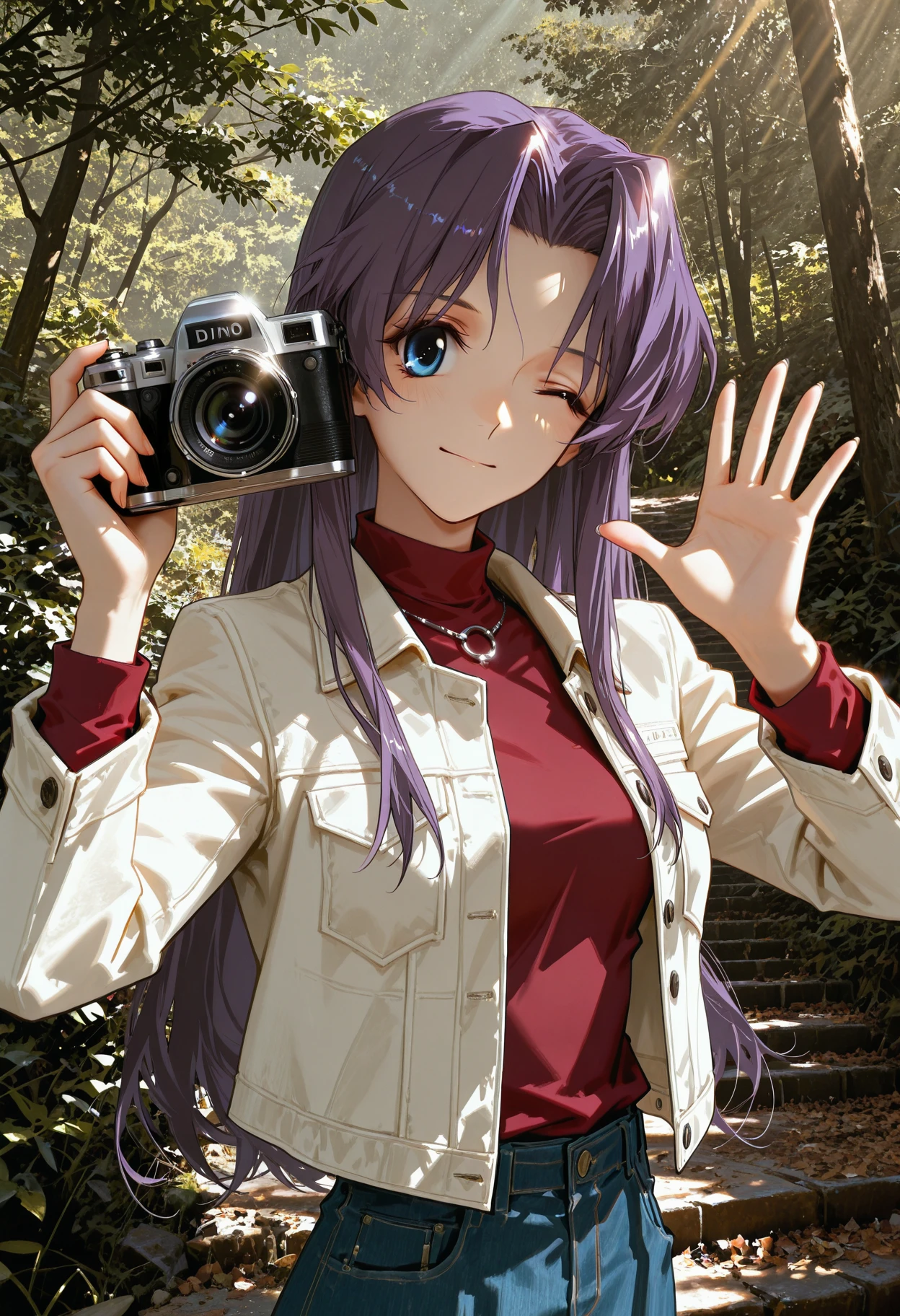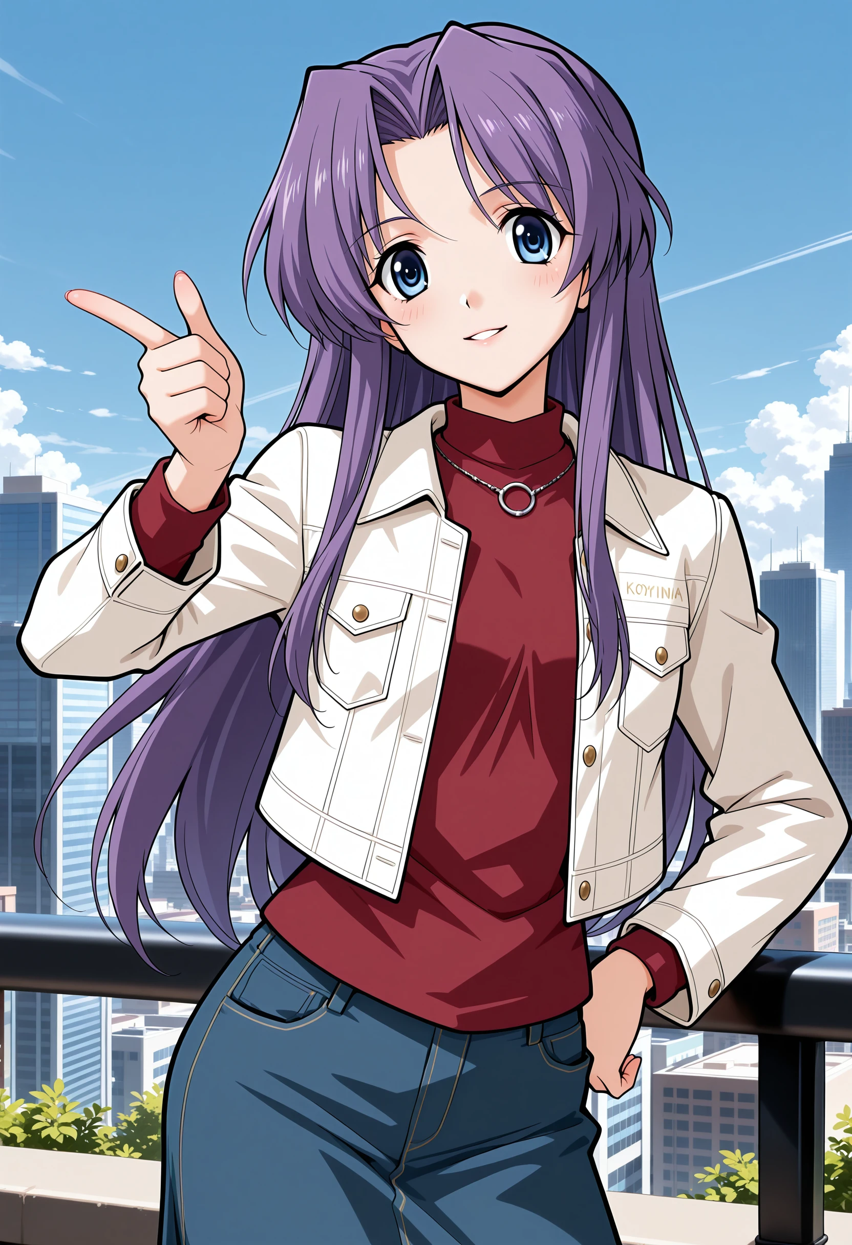 kirishima koyomi \(memories off 1\), koyomijacket, white jacket, white pockets, open jacket, red turtleneck, ring necklace, denim long skirt, hair down, blue eyes,