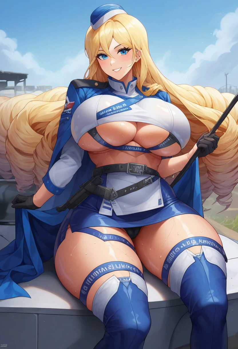 charrq, blue eyes, drill hair, blonde hair, long hair, huge breasts, high heel boots, underboob cutout, garrison cap, black gloves, skirt, thigh strap, beltbra