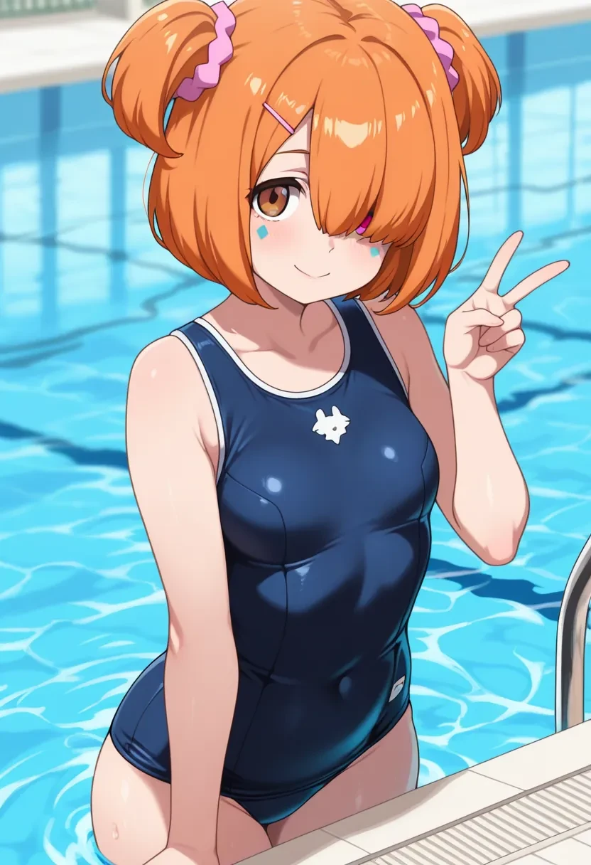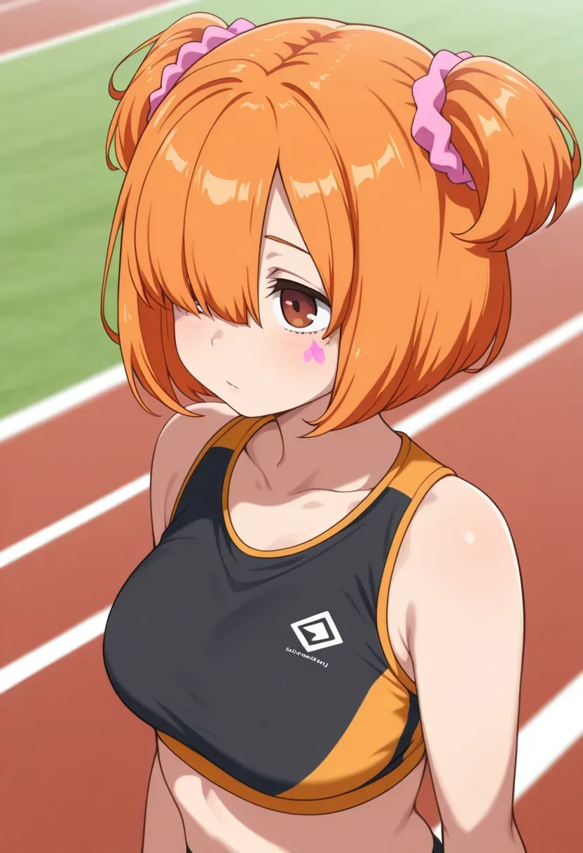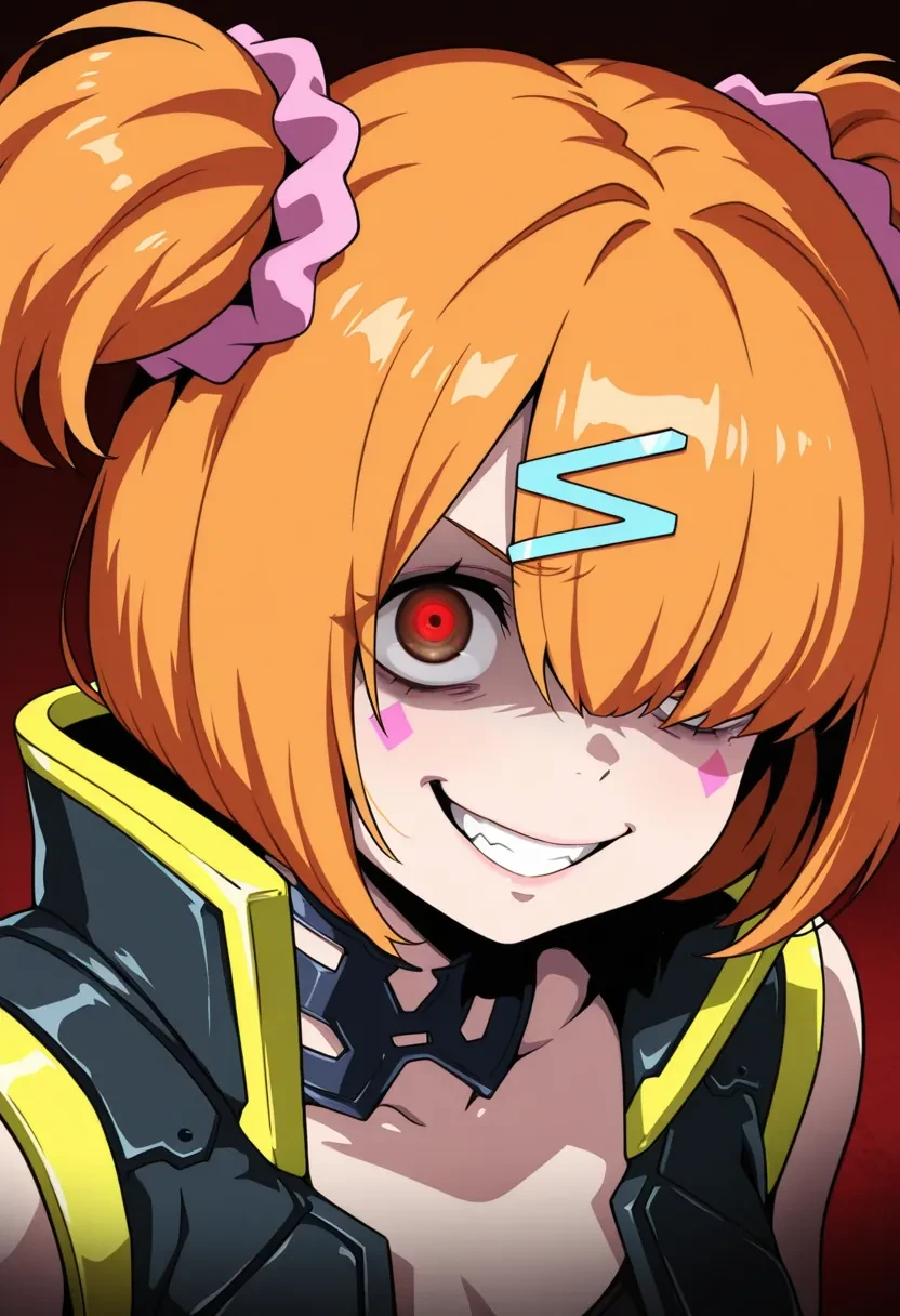 E9, pink scrunchie, orange hair, short hair, scrunchie, facial mark, hair ornament, twintails,hair over eyes,or