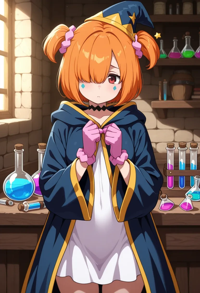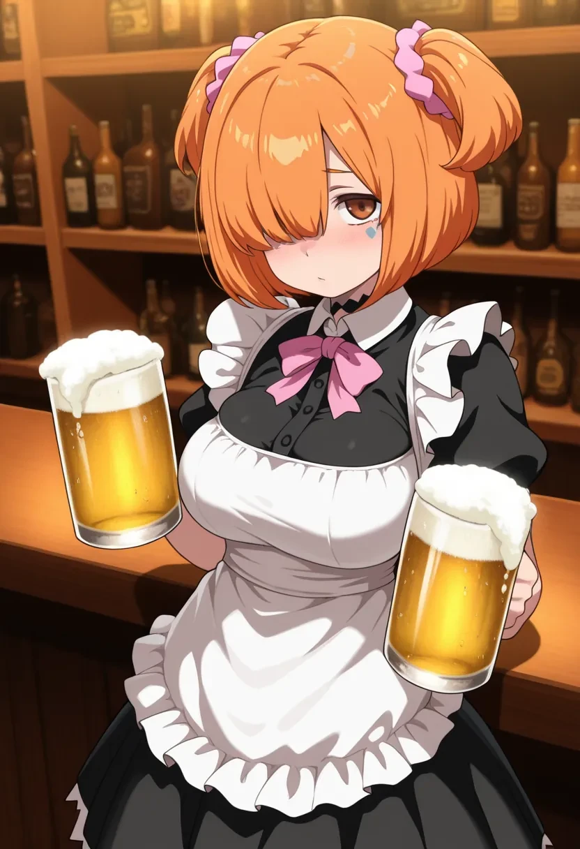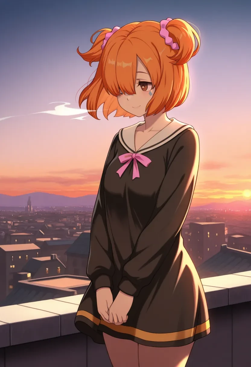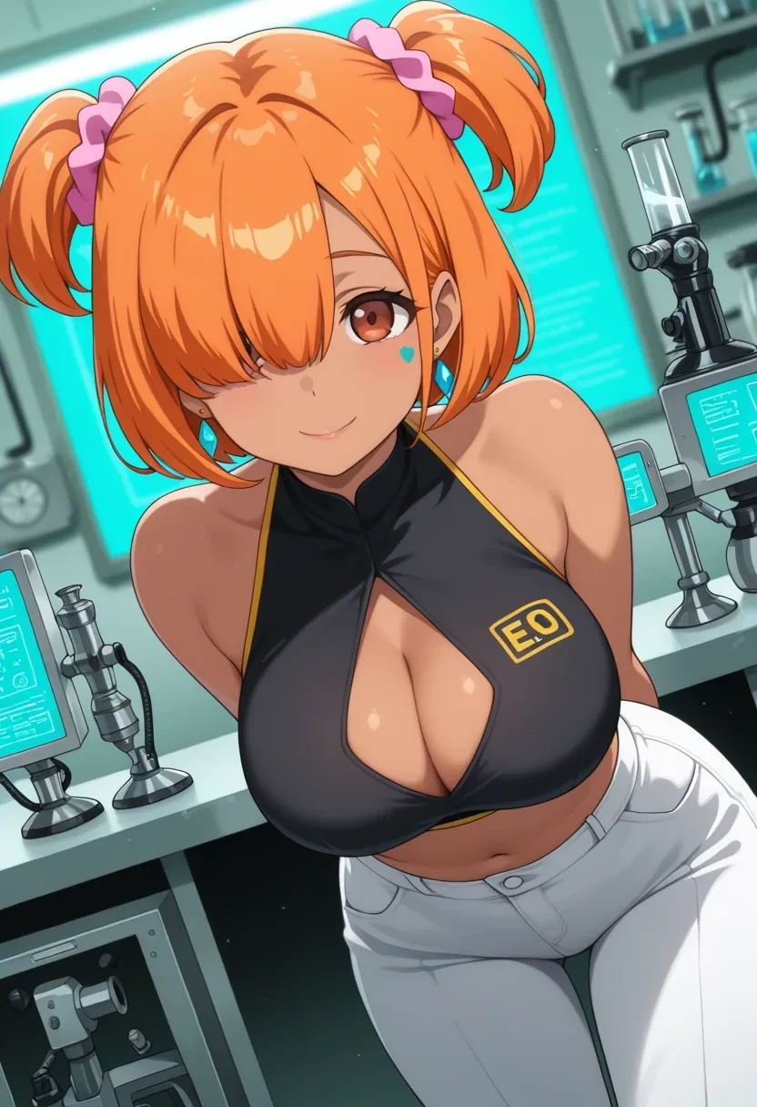E9, pink scrunchie, orange hair, short hair, scrunchie, facial mark, hair ornament, twintails,hair over eyes,or