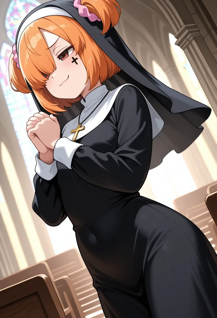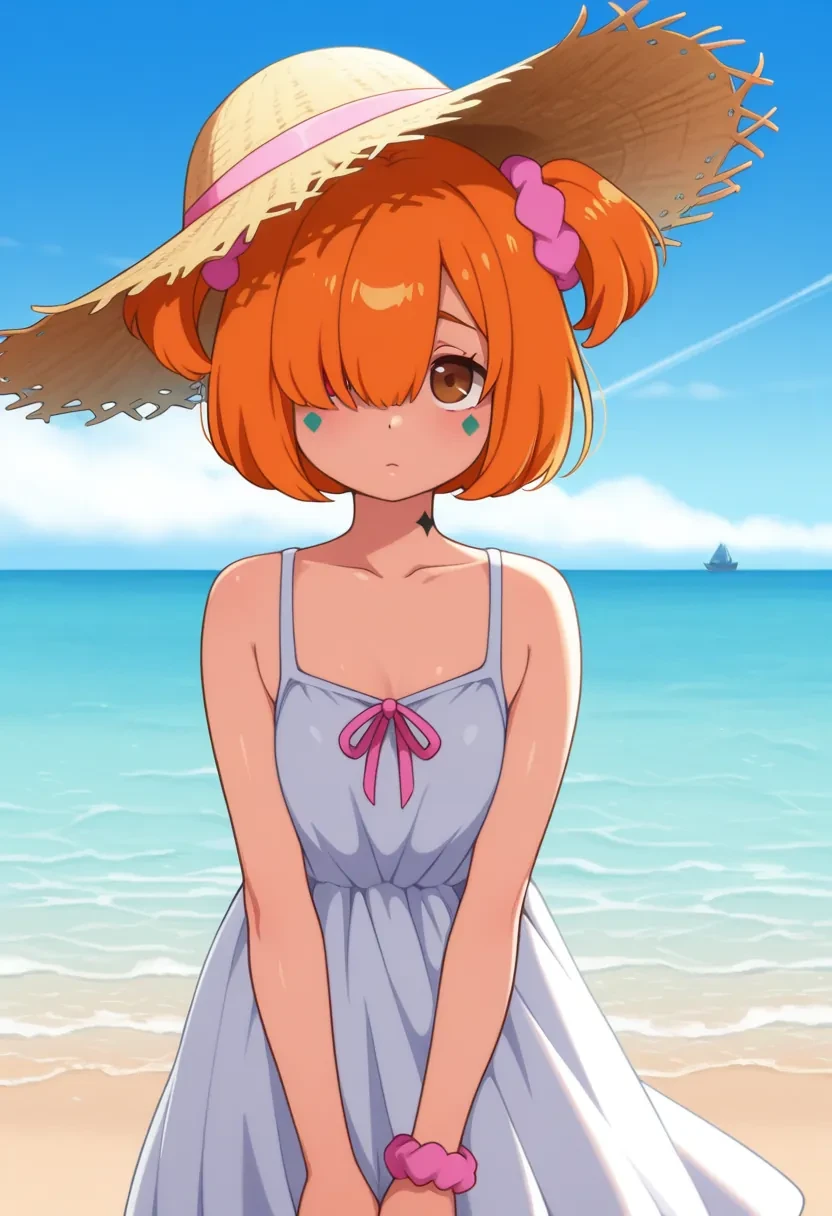 E9, pink scrunchie, orange hair, short hair, scrunchie, facial mark, hair ornament, twintails,