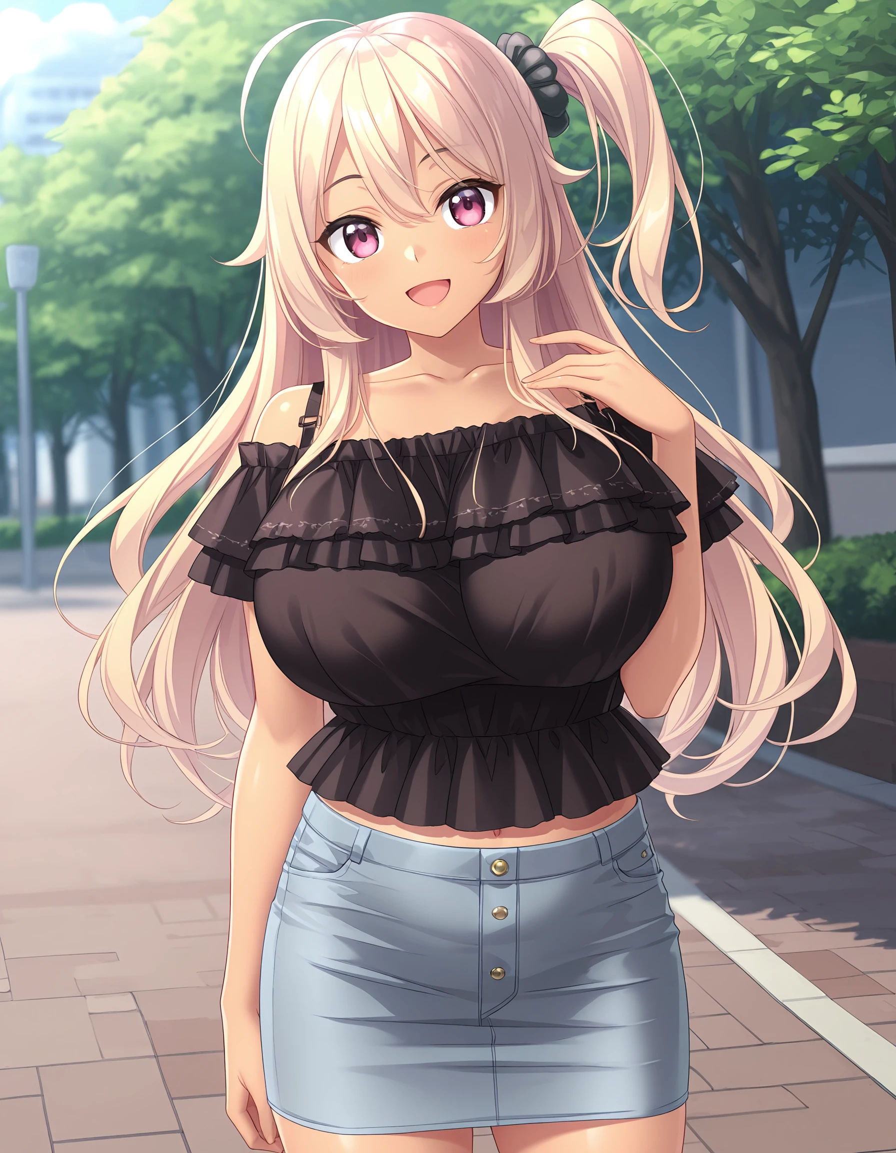 outfit02, shirt, black shirt, off shoulder shirt, frilled shirt, bra straps, skirt, blue skirt, denim skirt, pencil skirt, mini skirt, sandals, collarbone, underwear, purple underwear,