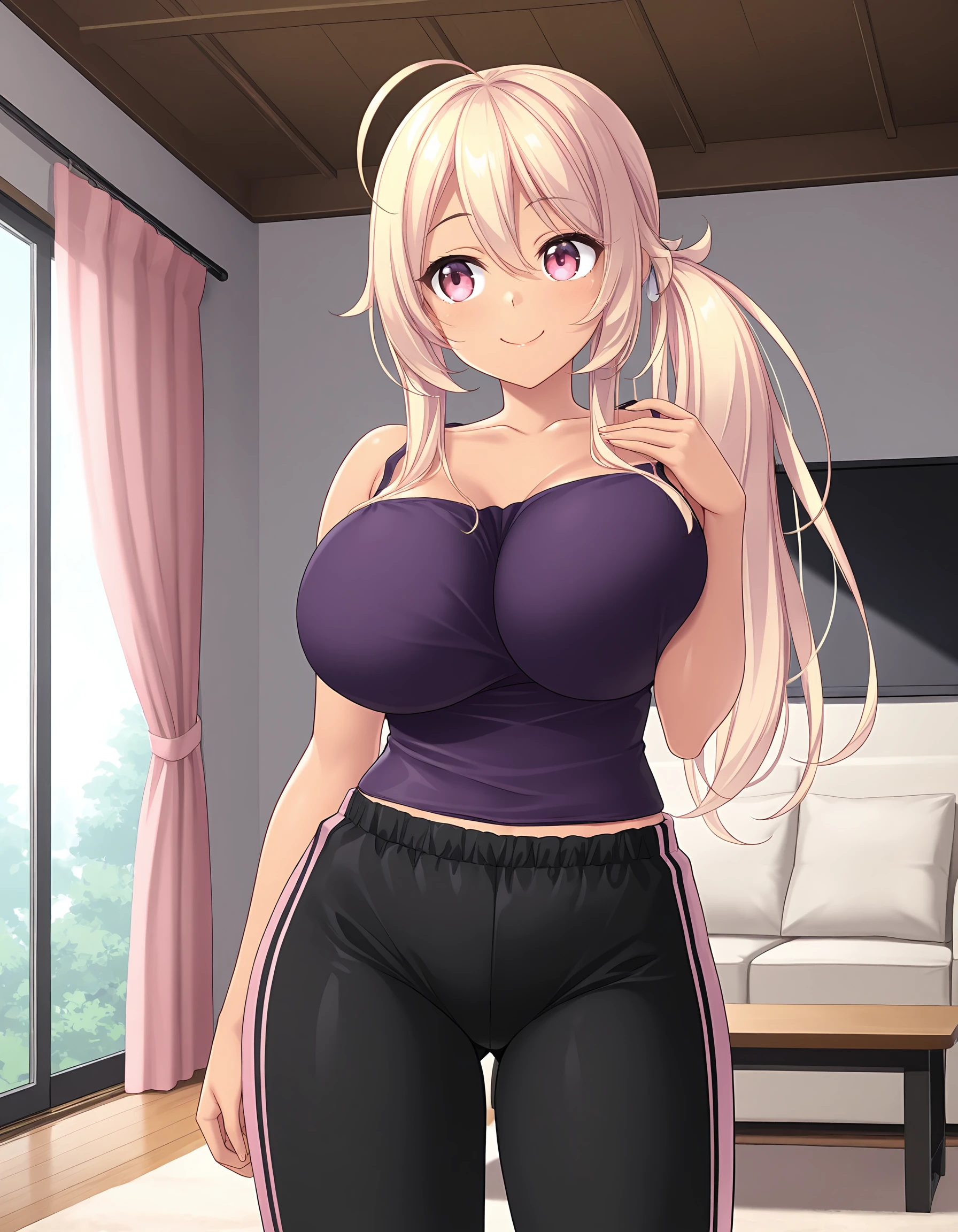 outfit03, camisole, purple camisole, camisole strap slip, pants, black pants, tracksuit pants, pink lined pants,