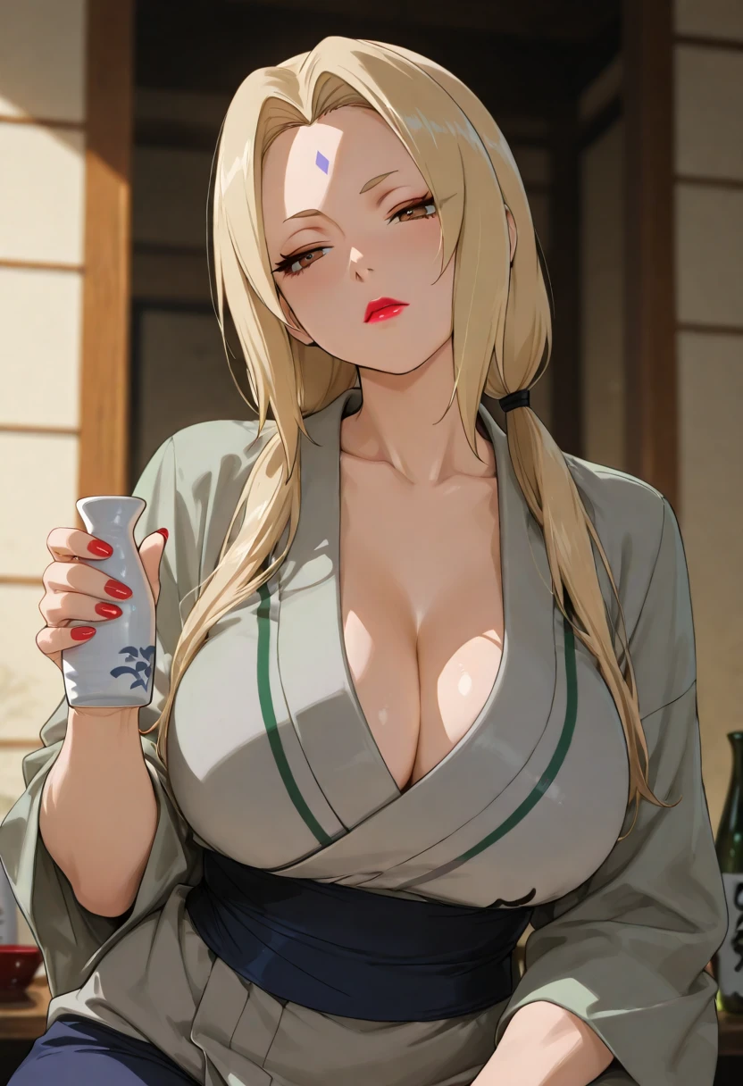 tsunade, blonde hair, long hair, brown eyes, low twintails, lipstick, forehead mark, 1girl, solo,