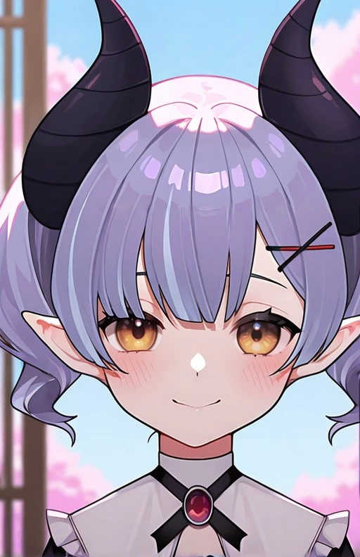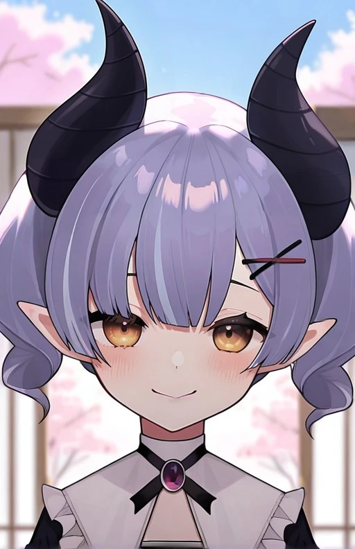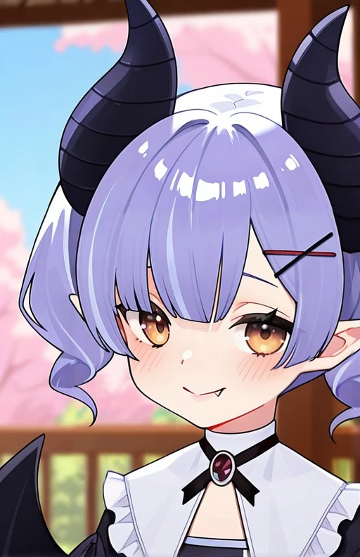 suzumiyaneiro, 1girl, solo, short hair, hair ornament, hair between eyes, twintails, brown eyes, blue hair, purple hair, horns, wings, pointy ears, virtual youtuber, hairclip, demon girl, demon horns, x hair ornament, brooch, black wings, demon wings, eyebrows hidden by hair, yellow eyes,