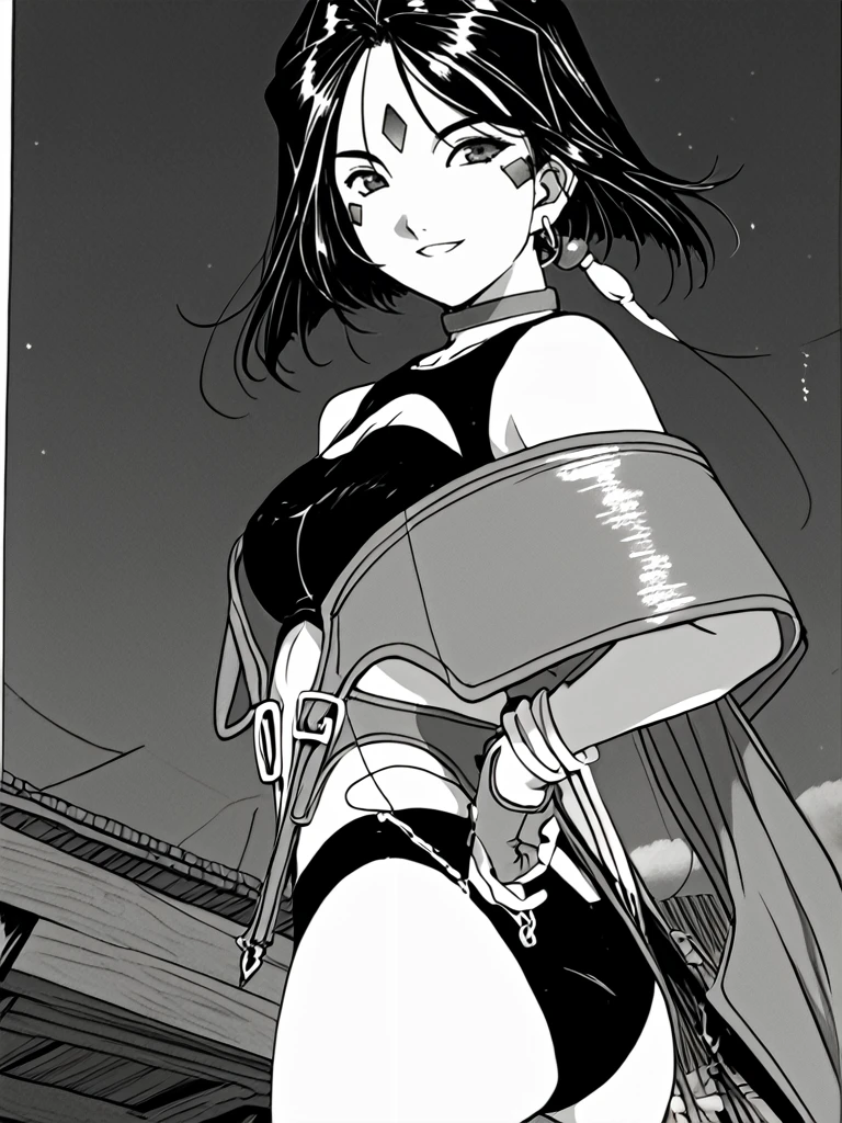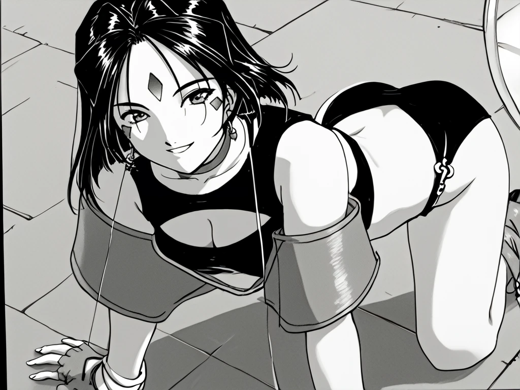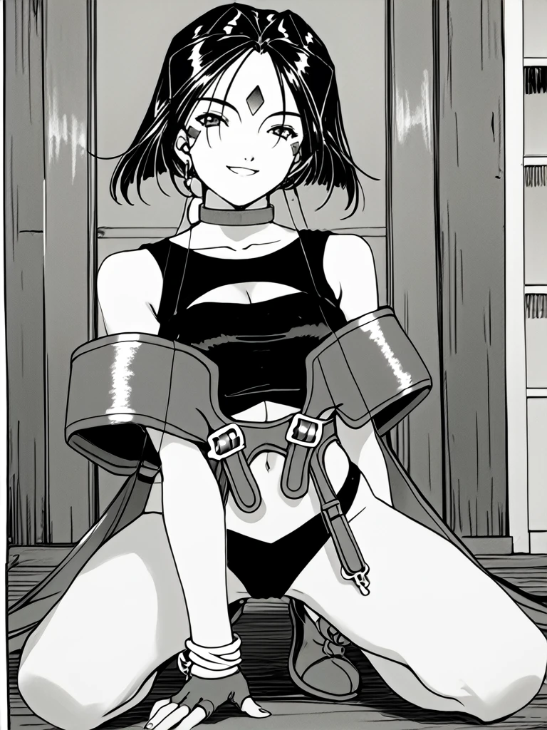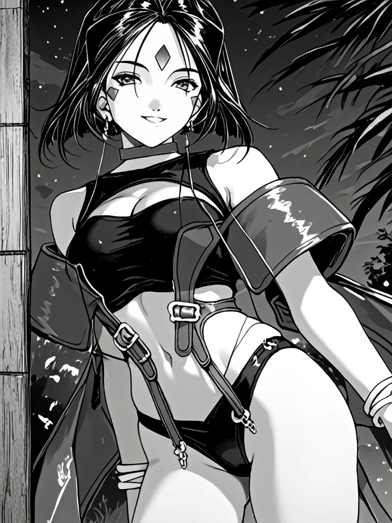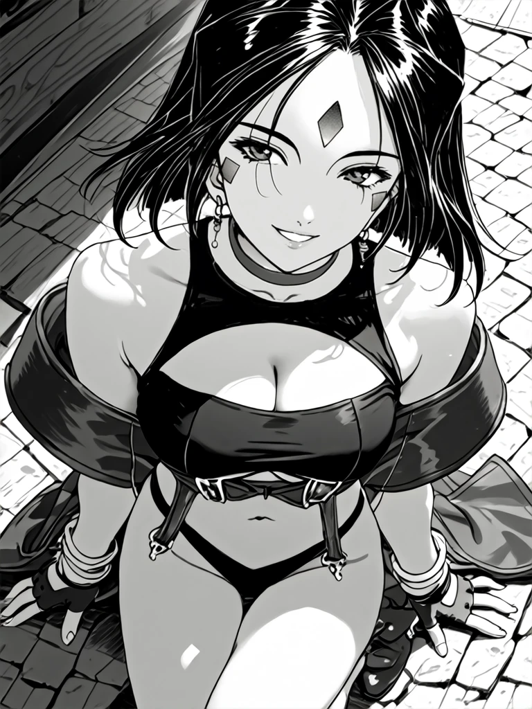 facial mark,fingerless gloves,forehead mark,black hair,short hair,ponytail,medium breasts,cleavage,navel,bare shoulders,long legs,earrings,choker,bracelet,panties,midriff,clothing cutout,cleavage cutout,(greyscale:1.5),(monochrome:1.5),
