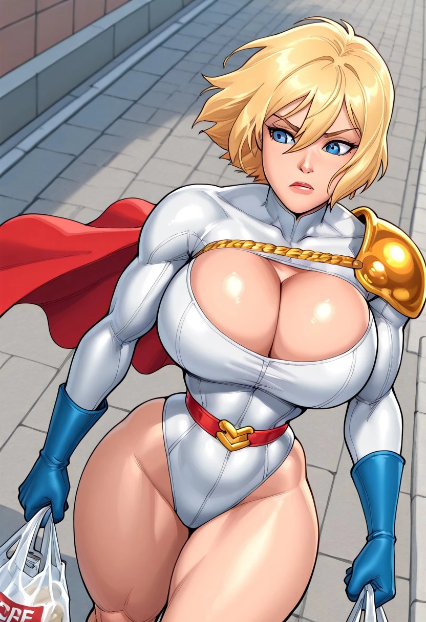 blonde hair, short hair, hair between eyes, blue eyes, huge breasts, muscular female,