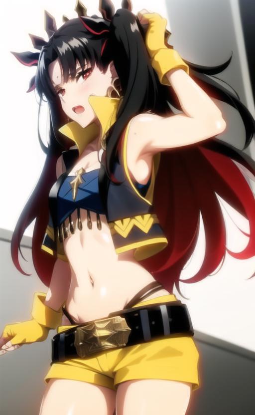 a woman with long hair wearing tight short ha outfit and leggings, 1girl, ishtar (fate), long hair, black hair, yellow shorts, red eyes, solo, shorts, red hair, gloves, yellow vest, earrings, jewelry, multicolored hair, two-tone hair, two side up, ass, breasts, looking at viewer, fingerless gloves, hoop earrings, short shorts, blush, belt, vest, bangs, room background, yellow gloves, cropped vest